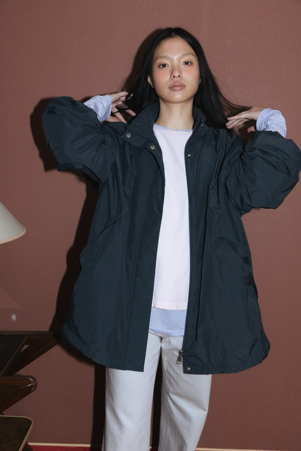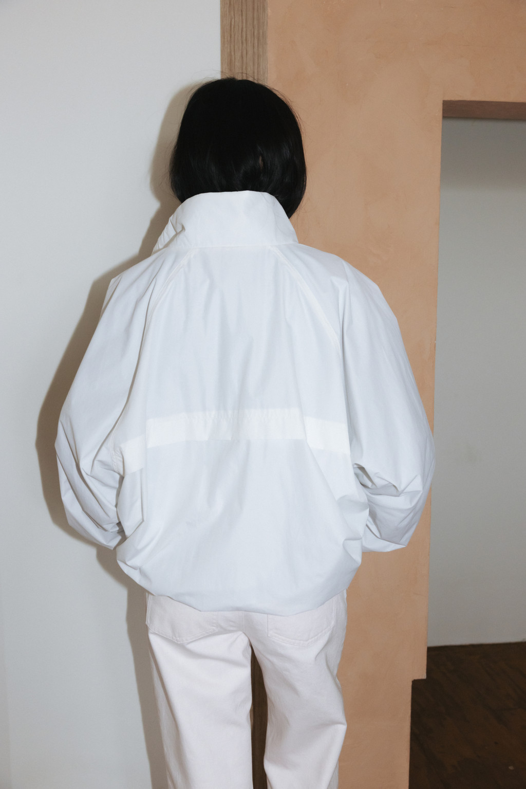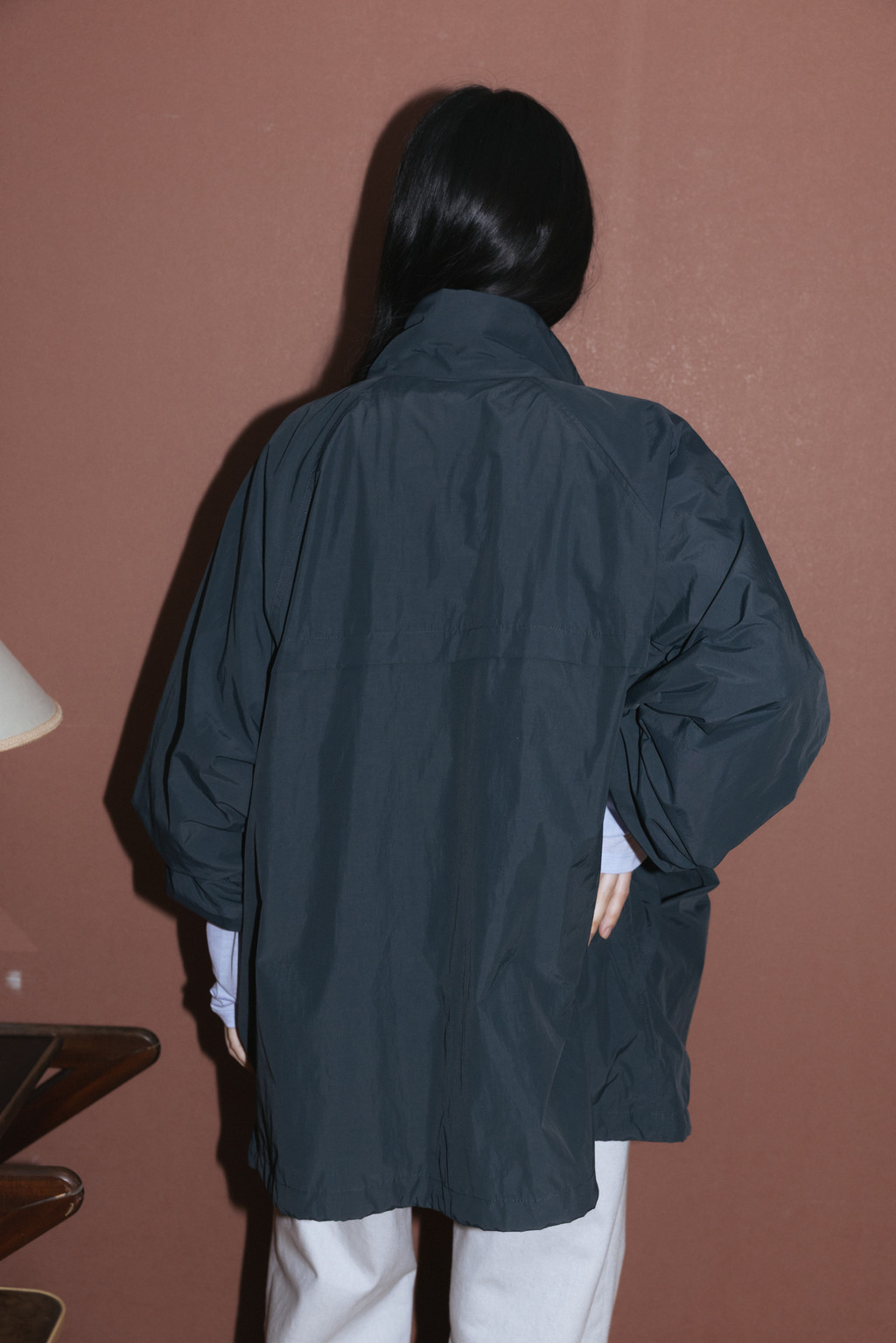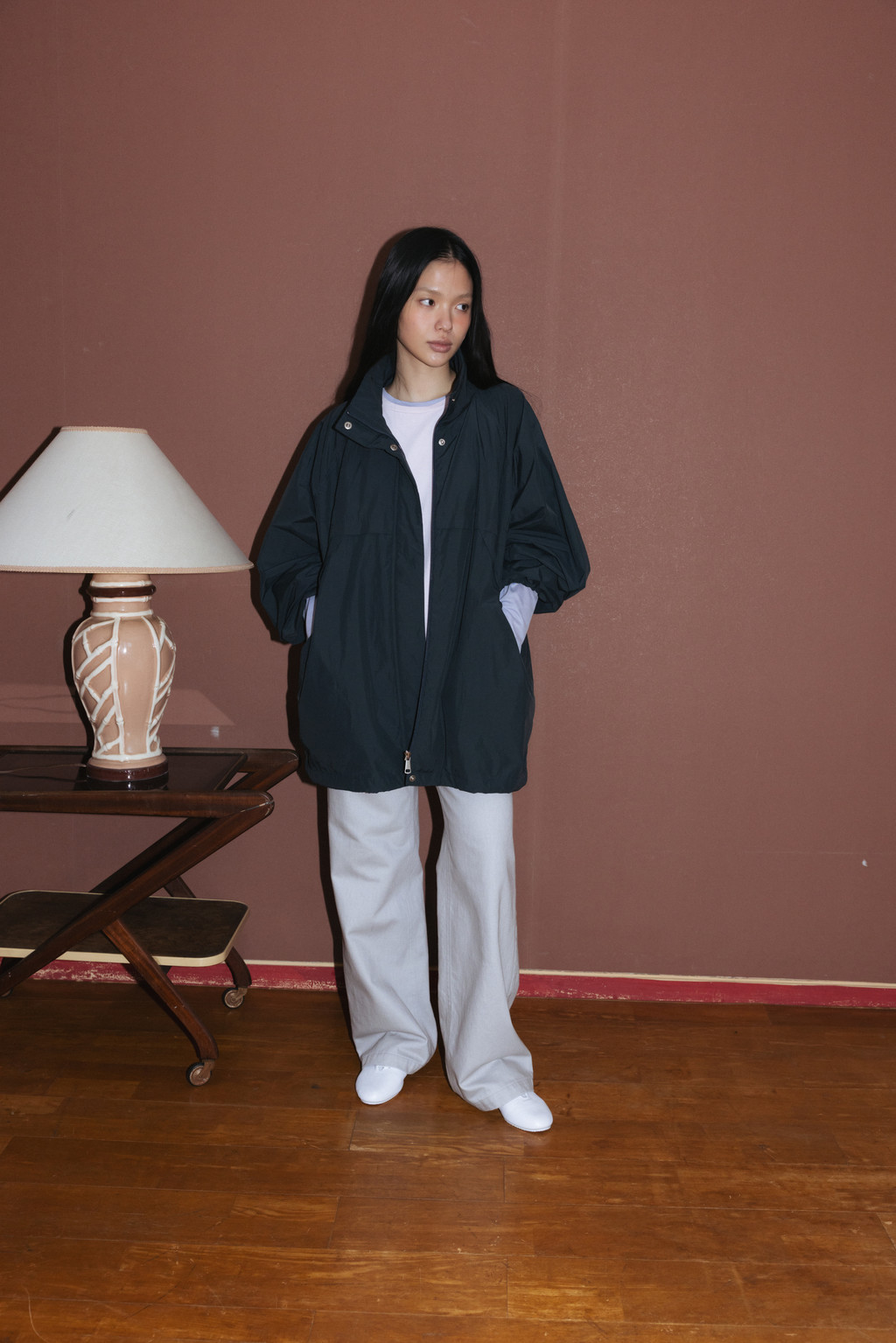 시원함이 느껴지는 바스락거리는 코튼 나일론 소재를 사용한 바람막이 점퍼입니다. 간절기 찬 바람을 막아주며, 엉덩이를 덮는 하프 기장과 넉넉한 사이즈로 편안하게 착용할 수 있습니다. 하이넥 디자인과 밑단 스트링 기능으로 다양한 실루엣 연출이 가능하며, 소매 끝 밴드가 바람을 막아주고 풍성한 볼륨감으로 연출되는 아이템입니다.