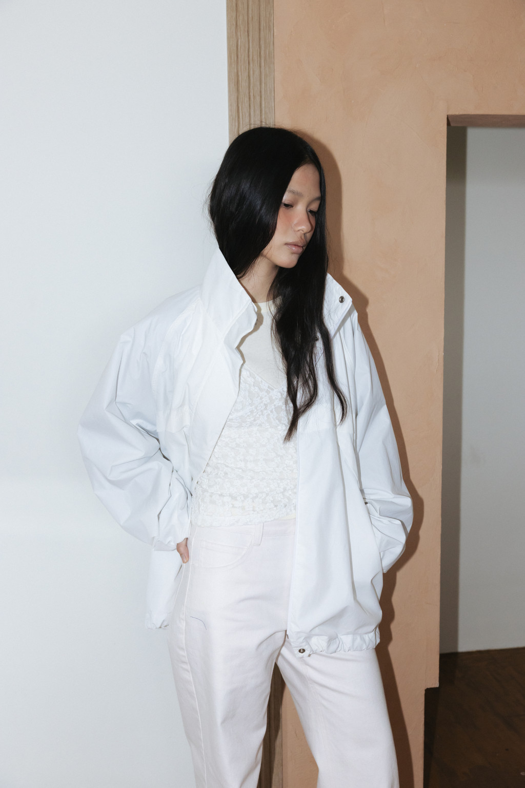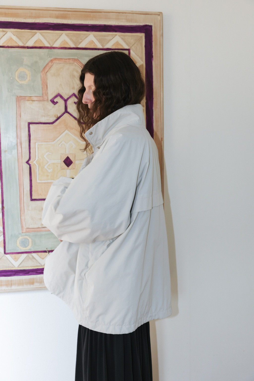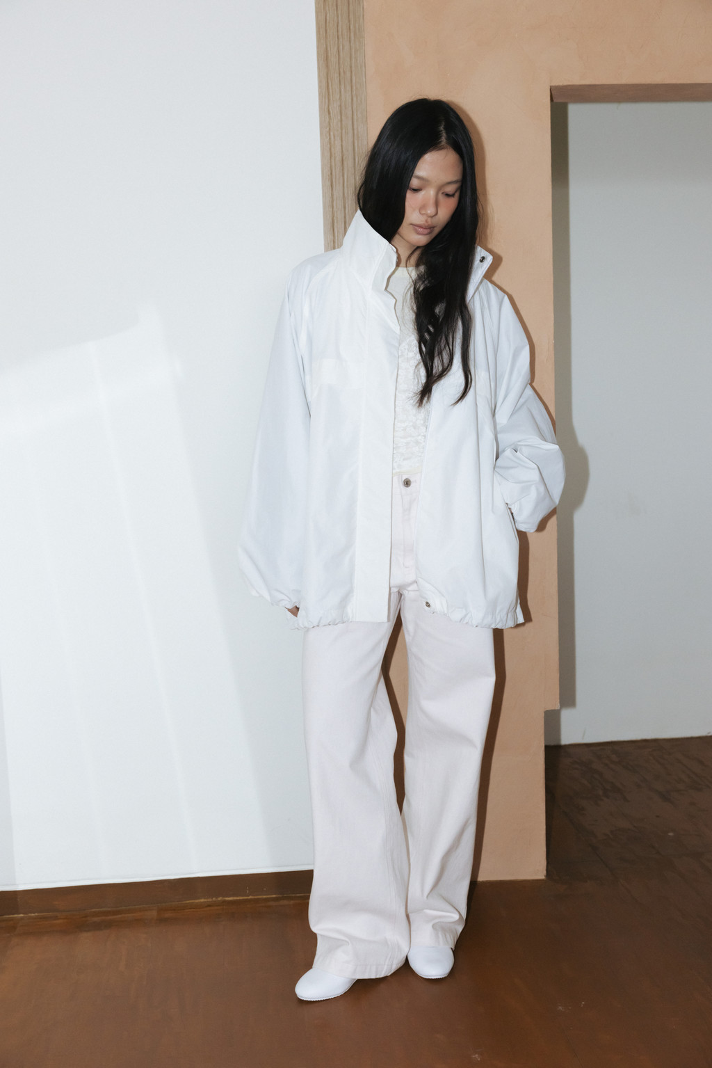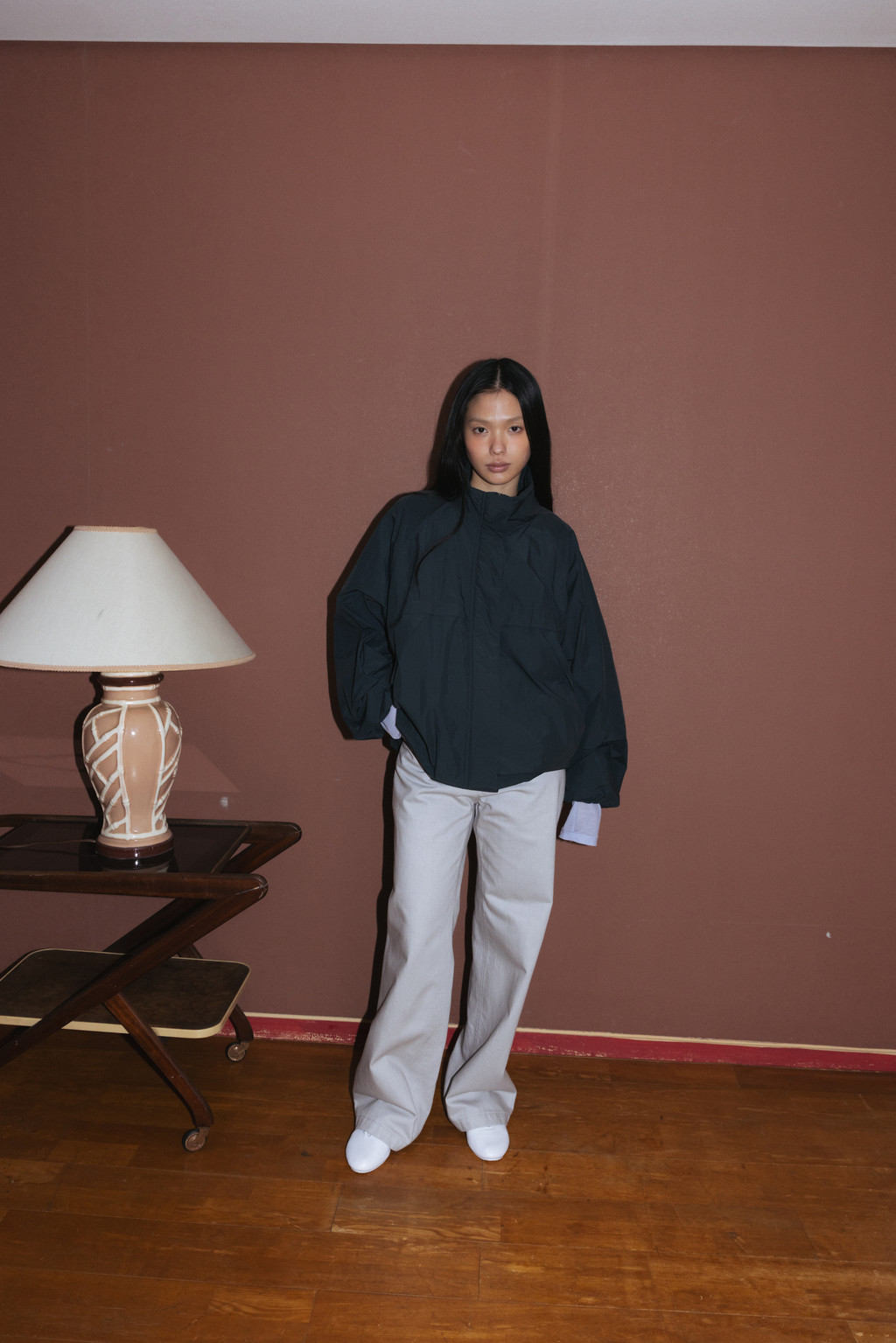 시원함이 느껴지는 바스락거리는 코튼 나일론 소재를 사용한 바람막이 점퍼입니다. 간절기 찬 바람을 막아주며, 엉덩이를 덮는 하프 기장과 넉넉한 사이즈로 편안하게 착용할 수 있습니다. 하이넥 디자인과 밑단 스트링 기능으로 다양한 실루엣 연출이 가능하며, 소매 끝 밴드가 바람을 막아주고 풍성한 볼륨감으로 연출되는 아이템입니다.