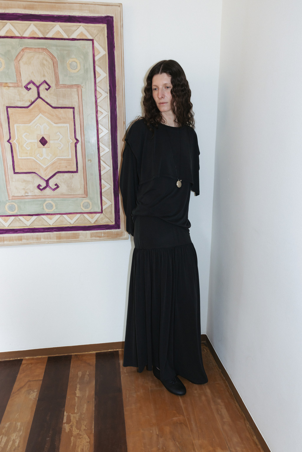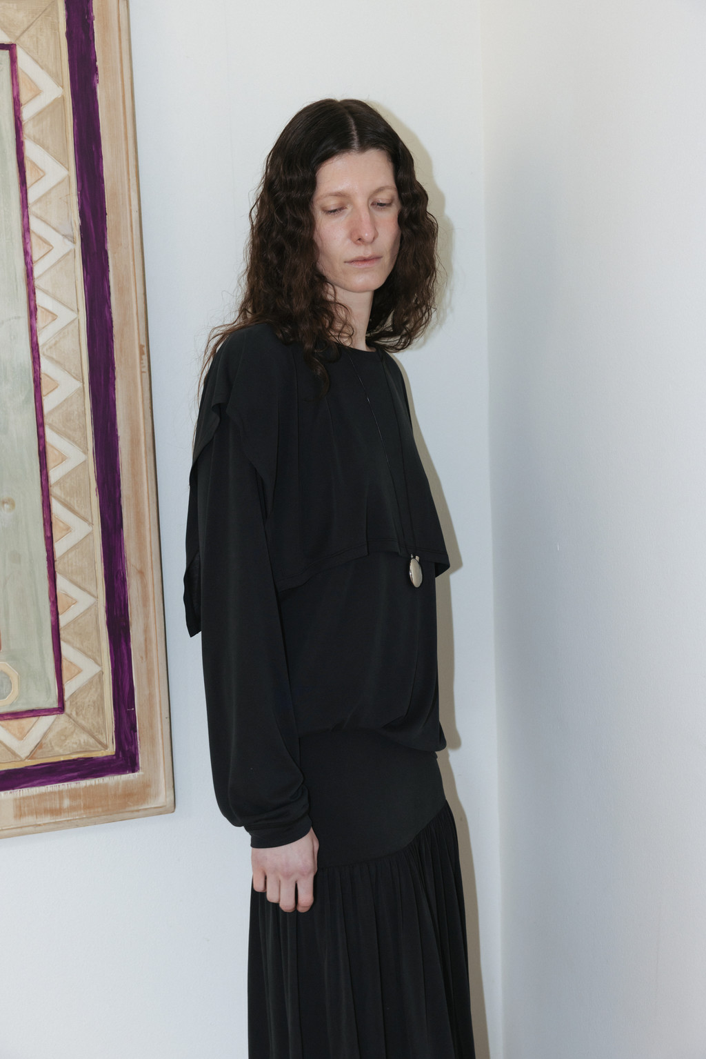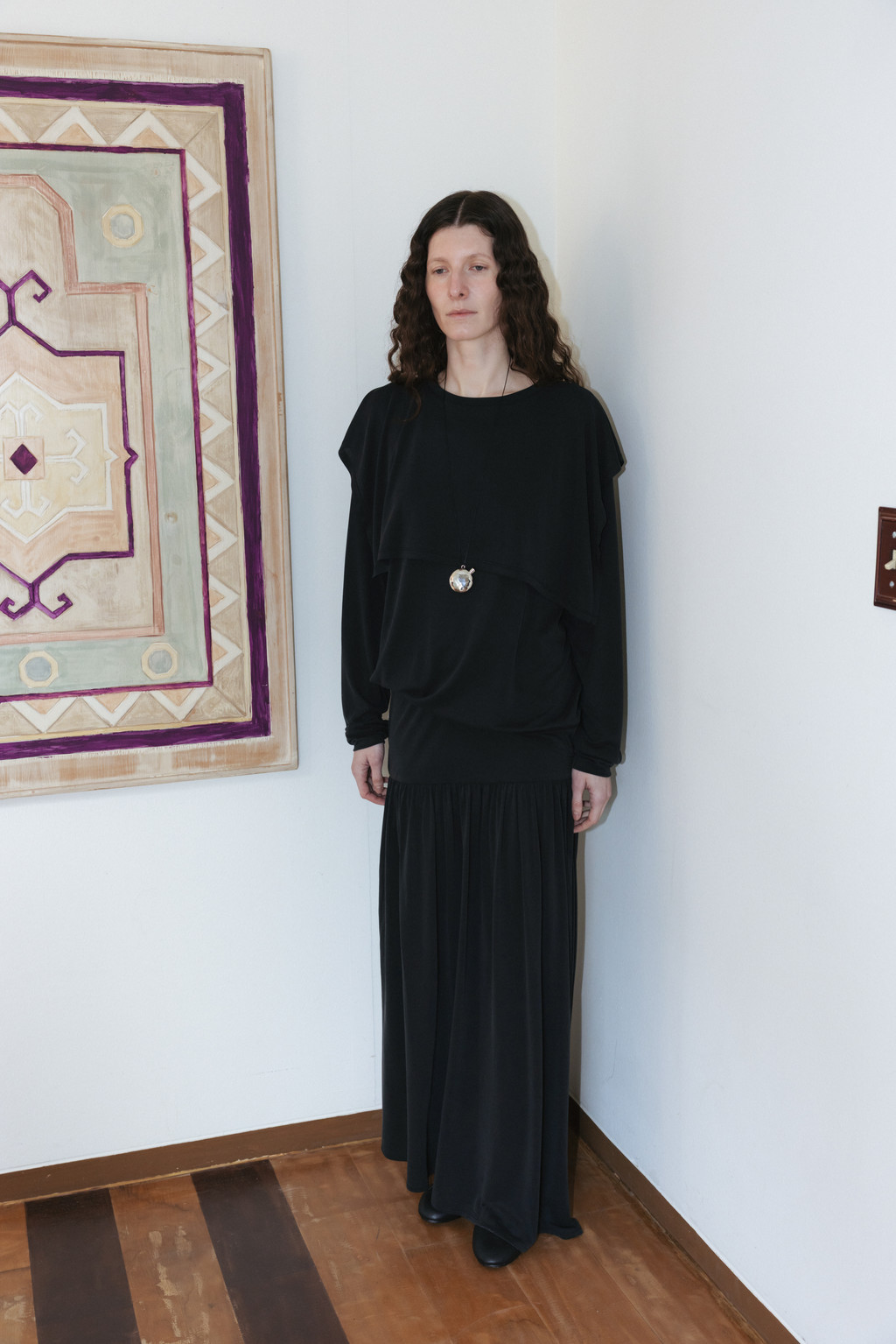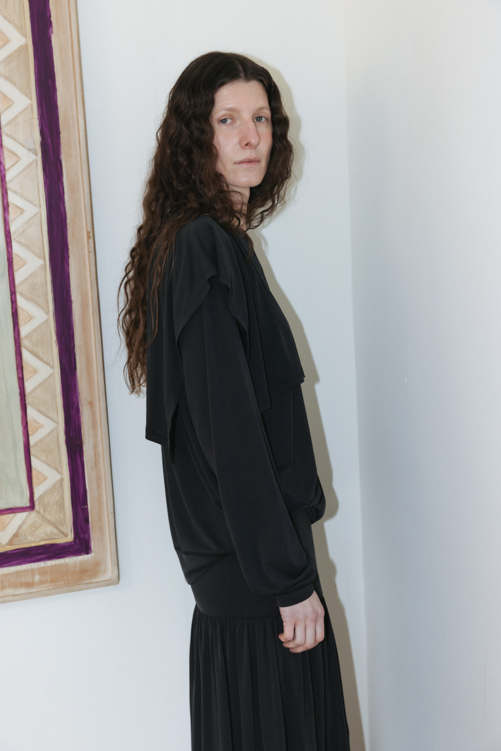 매끈한 표면감과 우수한 신축성을 지닌 저지 소재로 제작된 블라우스입니다. 넉넉한 블루종 형태에 케이프 디테일을 더해 구조적인 실루엣을 완성했으며, 착용 시 자연스럽게 흐르는 라인이 돋보입니다. 유연한 소재감으로 편안한 착용감을 느낄 수 있는 아이템입니다.