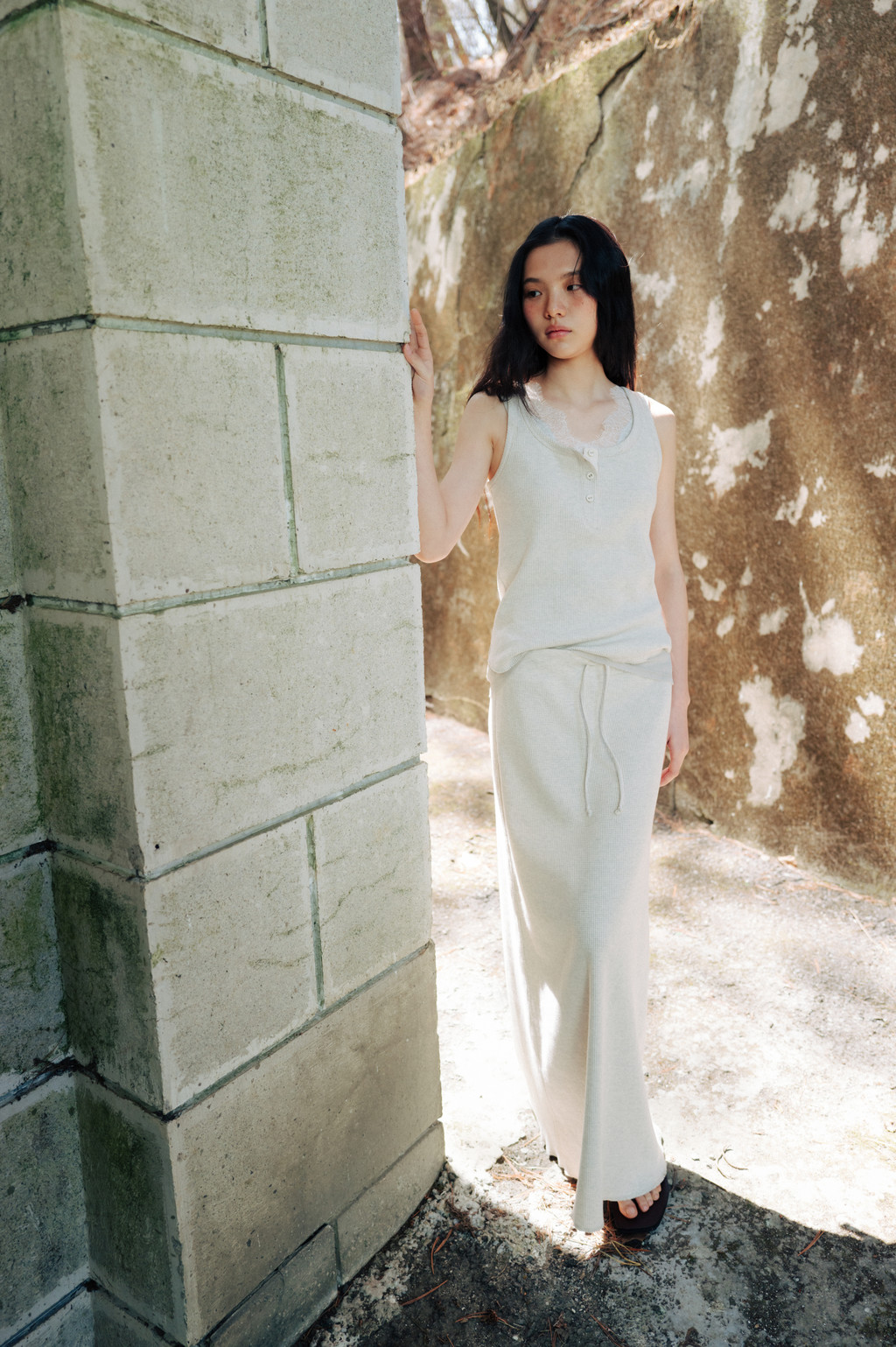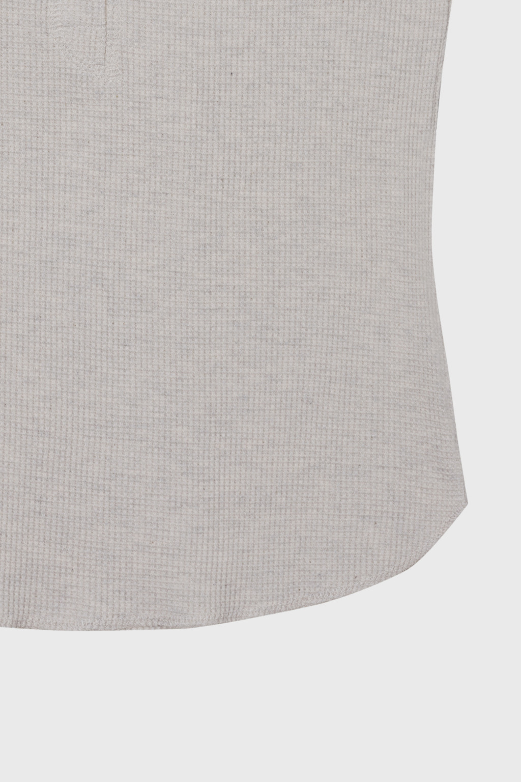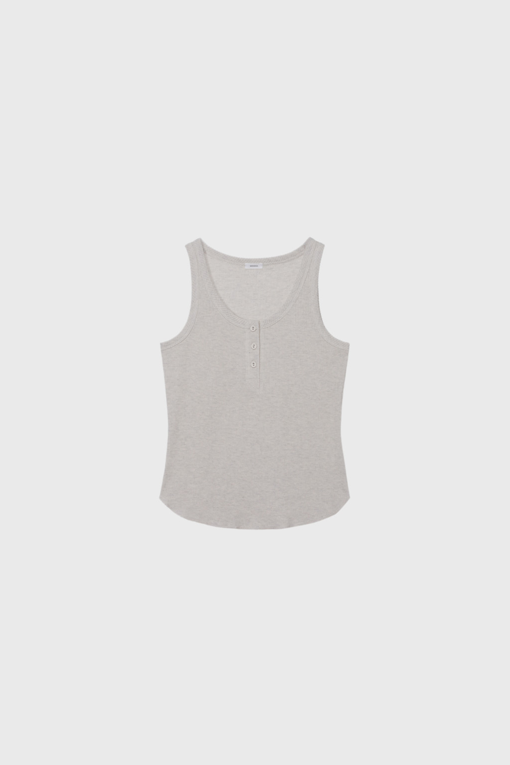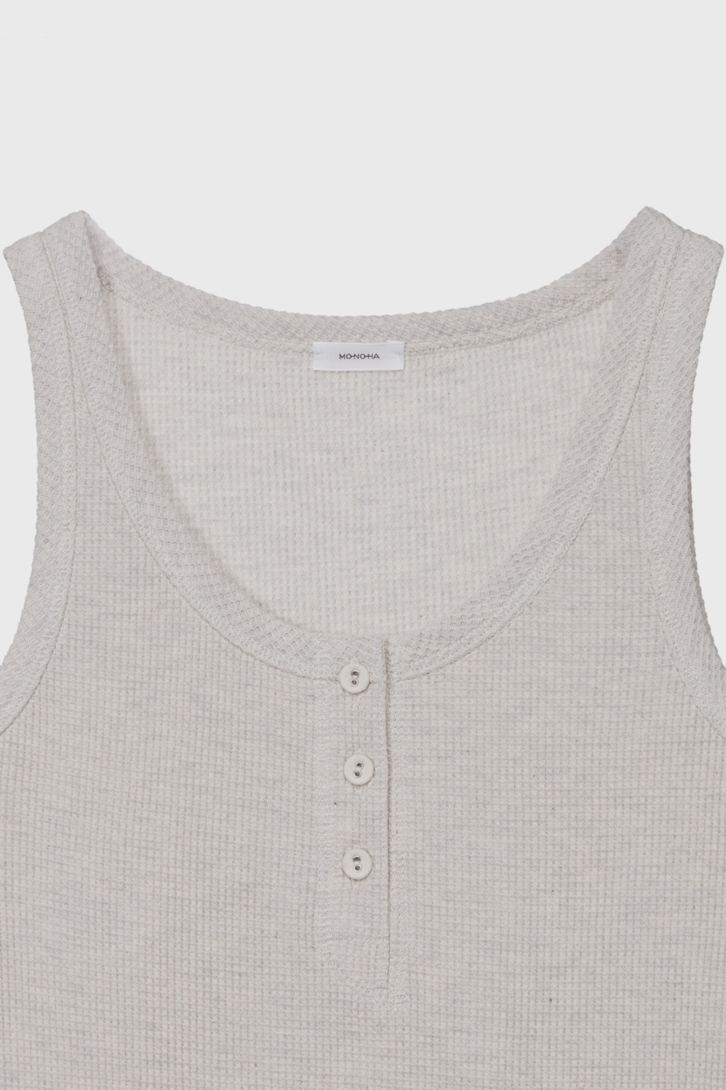 조직감이 살아있는 텍스처와 가볍고 통기성이 좋은 와플 조직 저지 소재로 제작된 슬리브리스입니다. 언더웨어를 연상시키는 릴랙스한 룩으로 이지웨어 무드가 특징이며, 신축성이 있는 소재가 몸에 부드럽게 밀착합니다. 단추 디테일이 포인트로 더해져 있습니다.