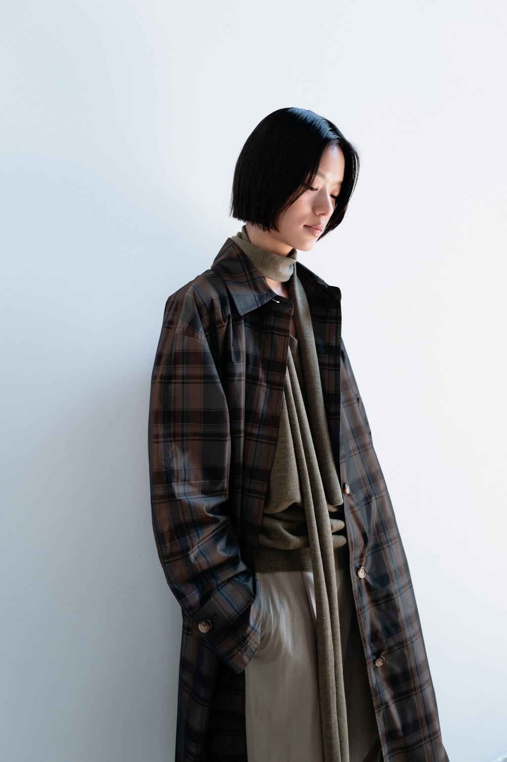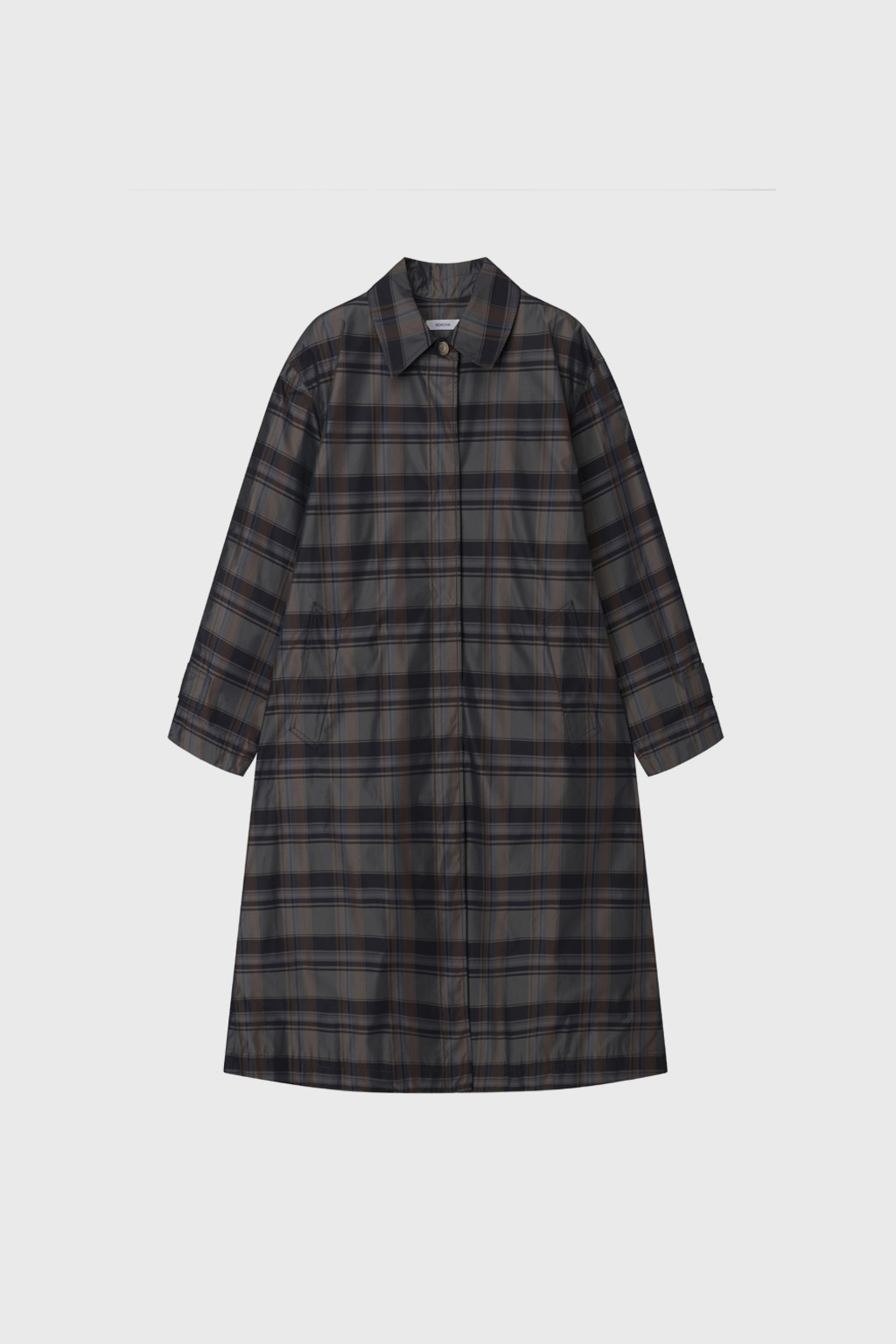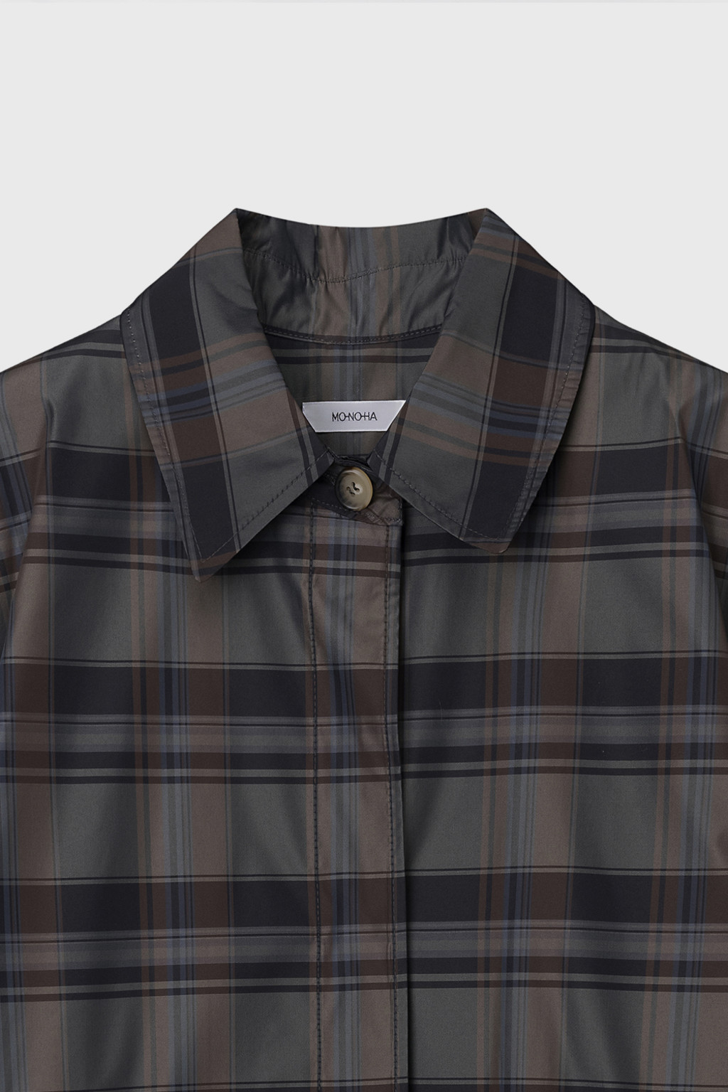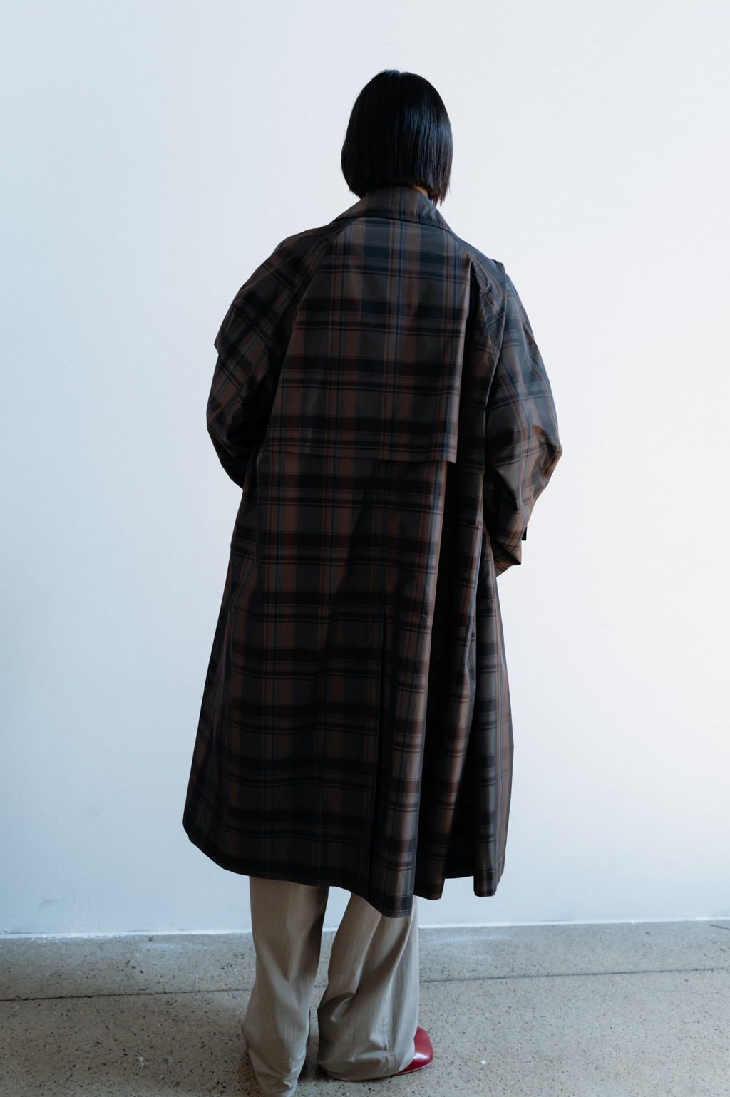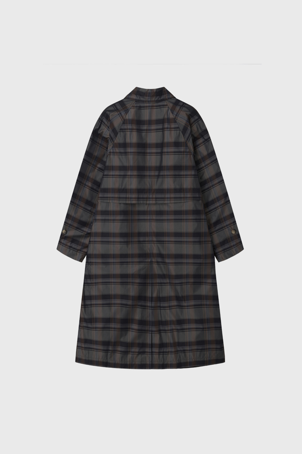 가볍고 바삭한 촉감의 폴리 혼방 소재로 형태감을 잘 살려주는 트렌치코트입니다. 은은한 광택이 도는 질감에 클래식한 카키 브라운 체크 패턴이 더해져 빈티지하면서도 세련된 분위기를 연출합니다. 전체 라이닝 처리로 완성도를 높였으며, 볼륨감 있는 레글런 소매가 특징입니다.