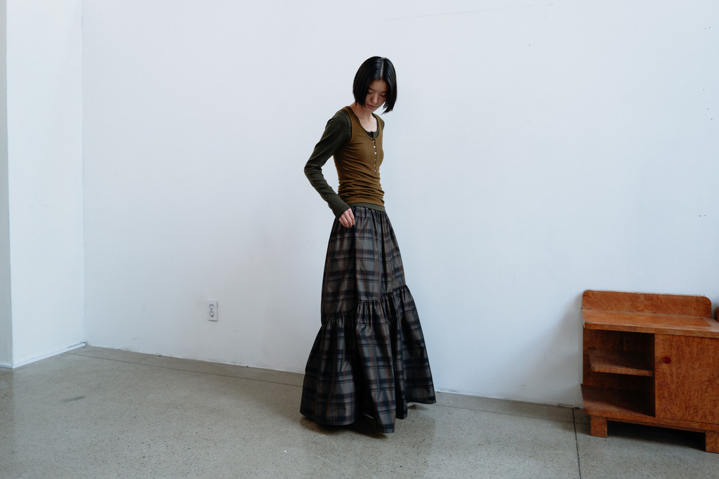가볍고 바삭한 촉감의 폴리 혼방 소재로 형태감을 잘 잡아주는 스커트입니다. 은은한 광택이 느껴지는 질감과 클래식한 카키 브라운 체크 패턴이 어우러져 빈티지하면서도 고급스러운 분위기를 연출합니다. 허리 밴딩과 절개, 셔링 디테일을 더해 풍성한 볼륨감의 실루엣이 특징입니다.