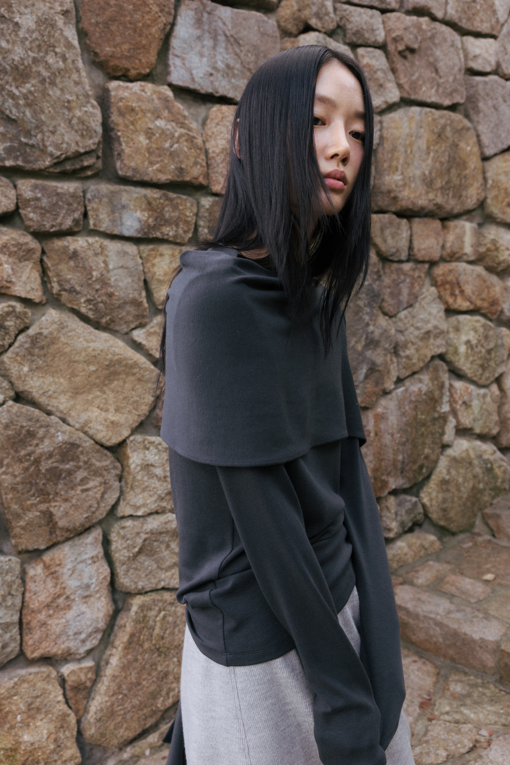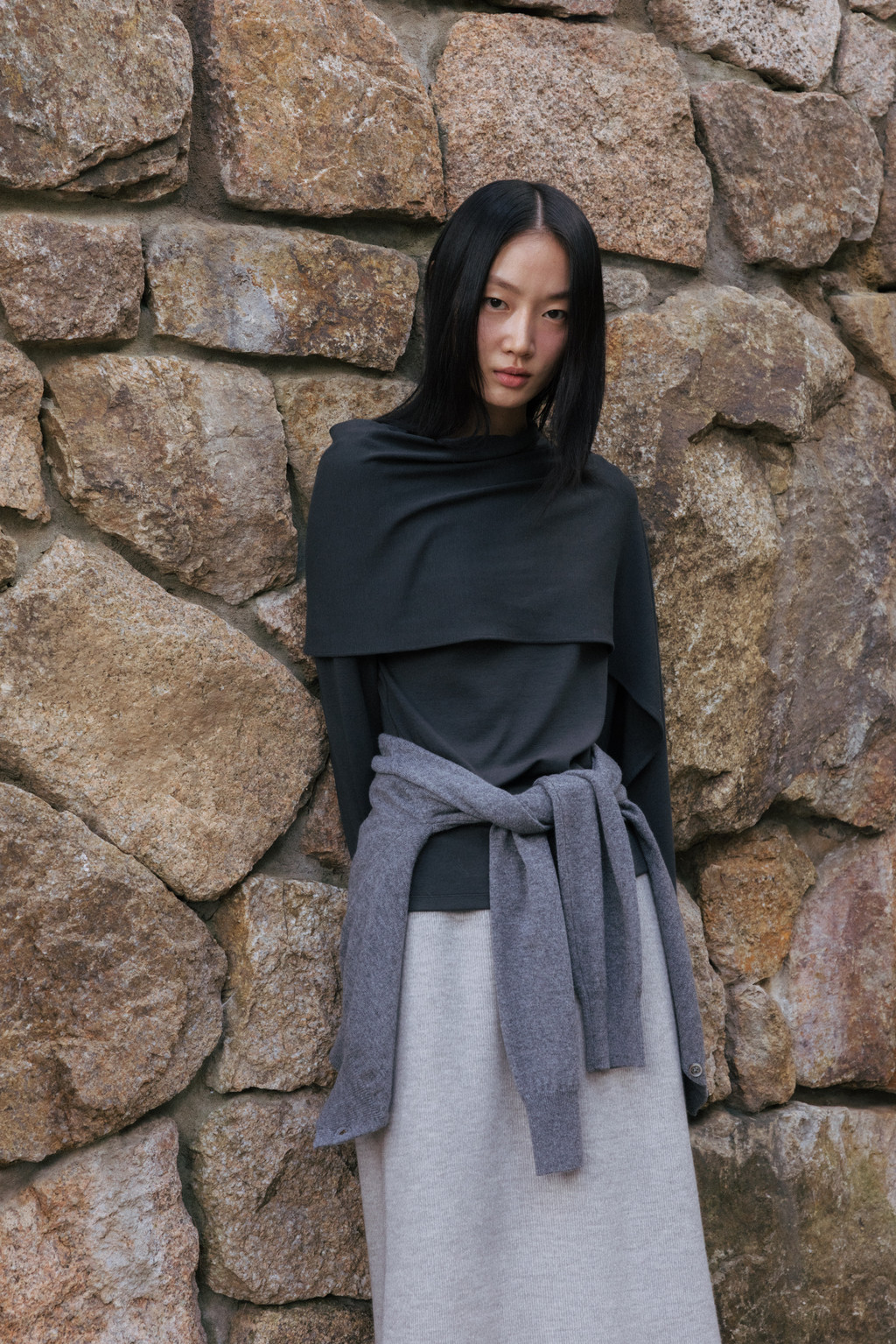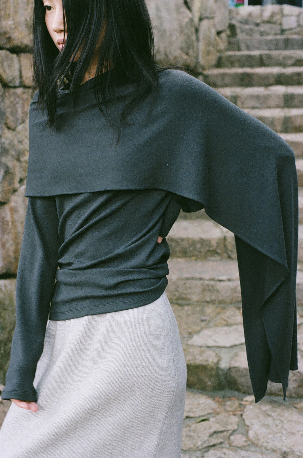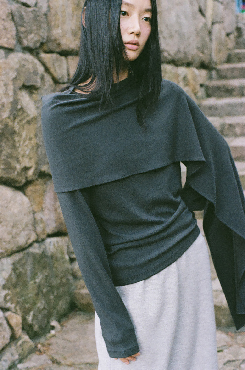 한겨울 착용하기 좋은 울 혼방 저지 소재로 제작된 티셔츠입니다. 신축성이 좋아 사이즈에 구애받지 않고 착용할 수 있으며, 길게 연결된 머플러 디테일로 다양하게 연출 가능한 아이템입니다.