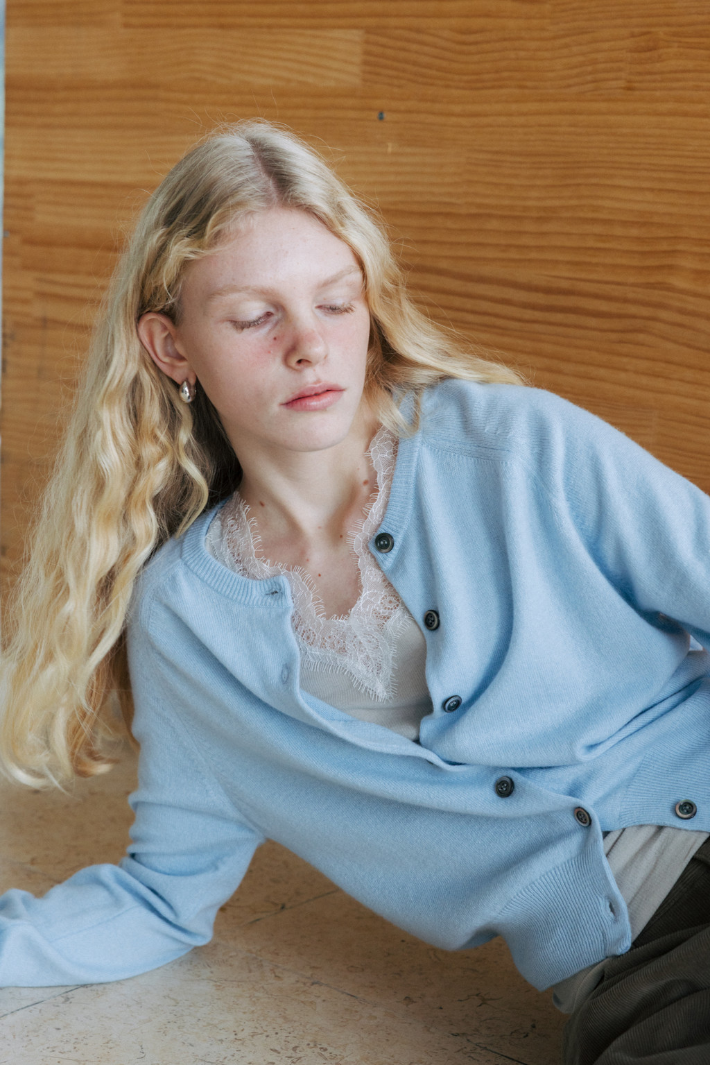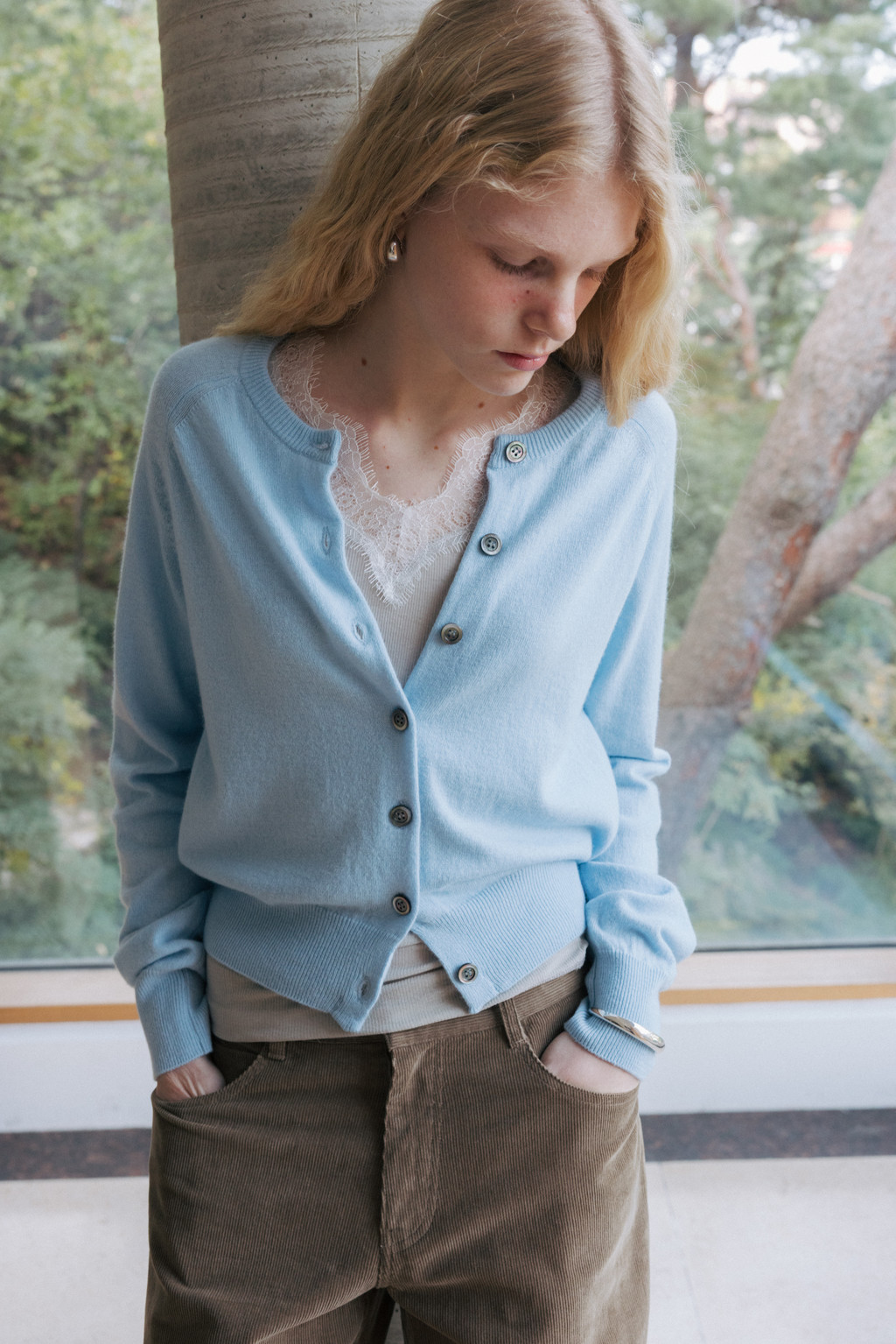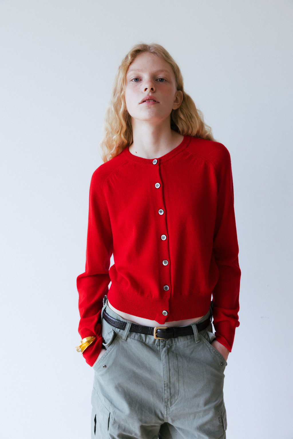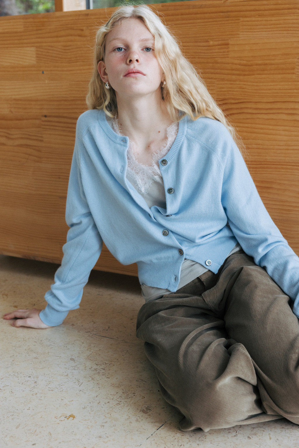 Cashmere round neck cardigan (ivory / light gray / blue / red / light brown)