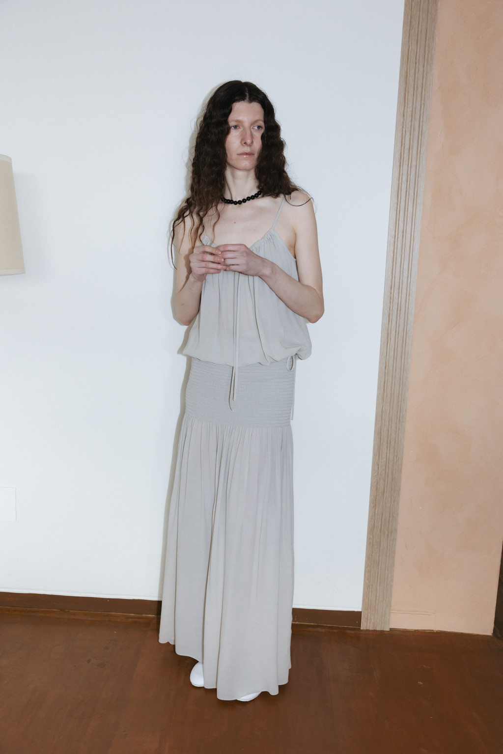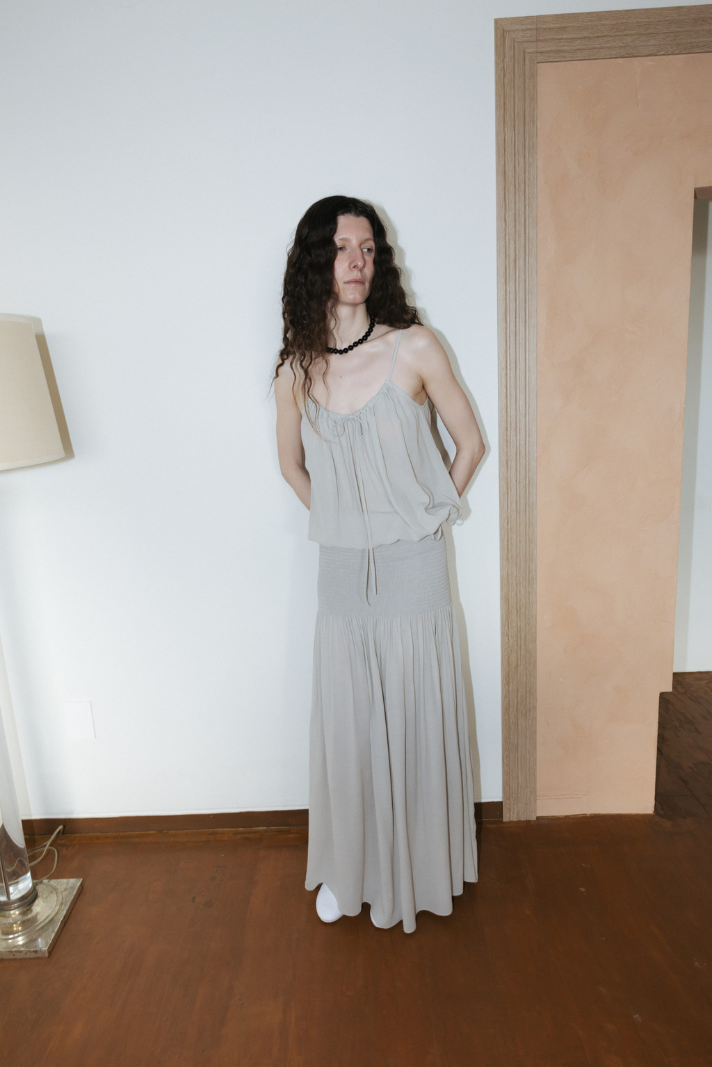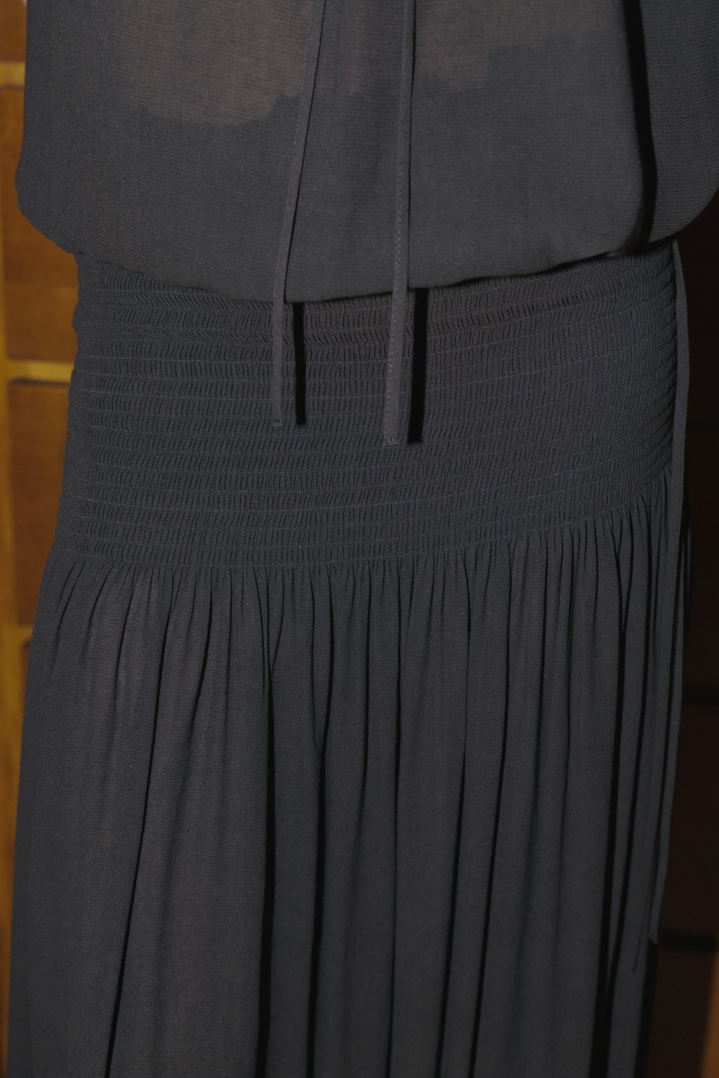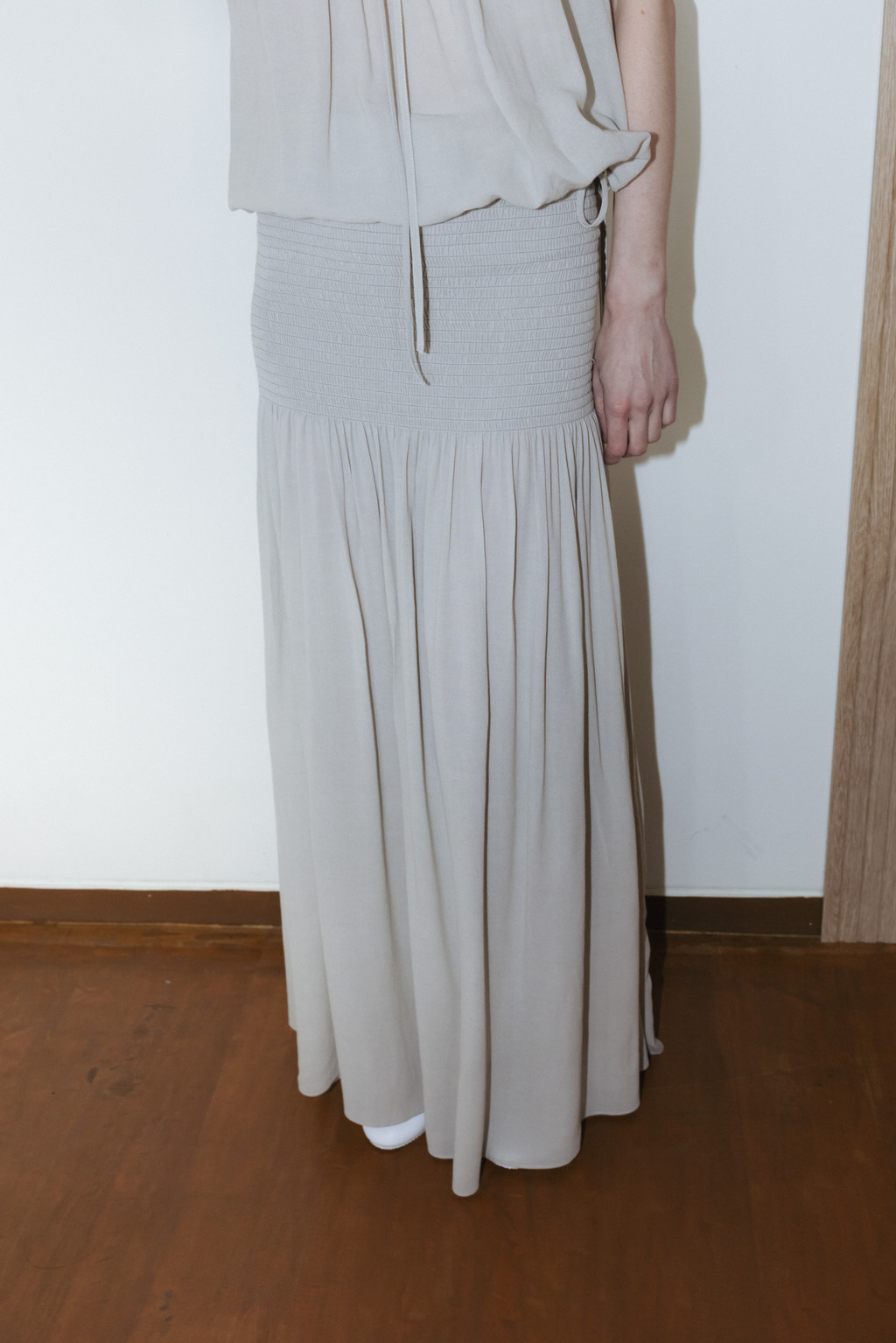 Draped Shirred Long Skirt (Light Gray / Brown)NEW
