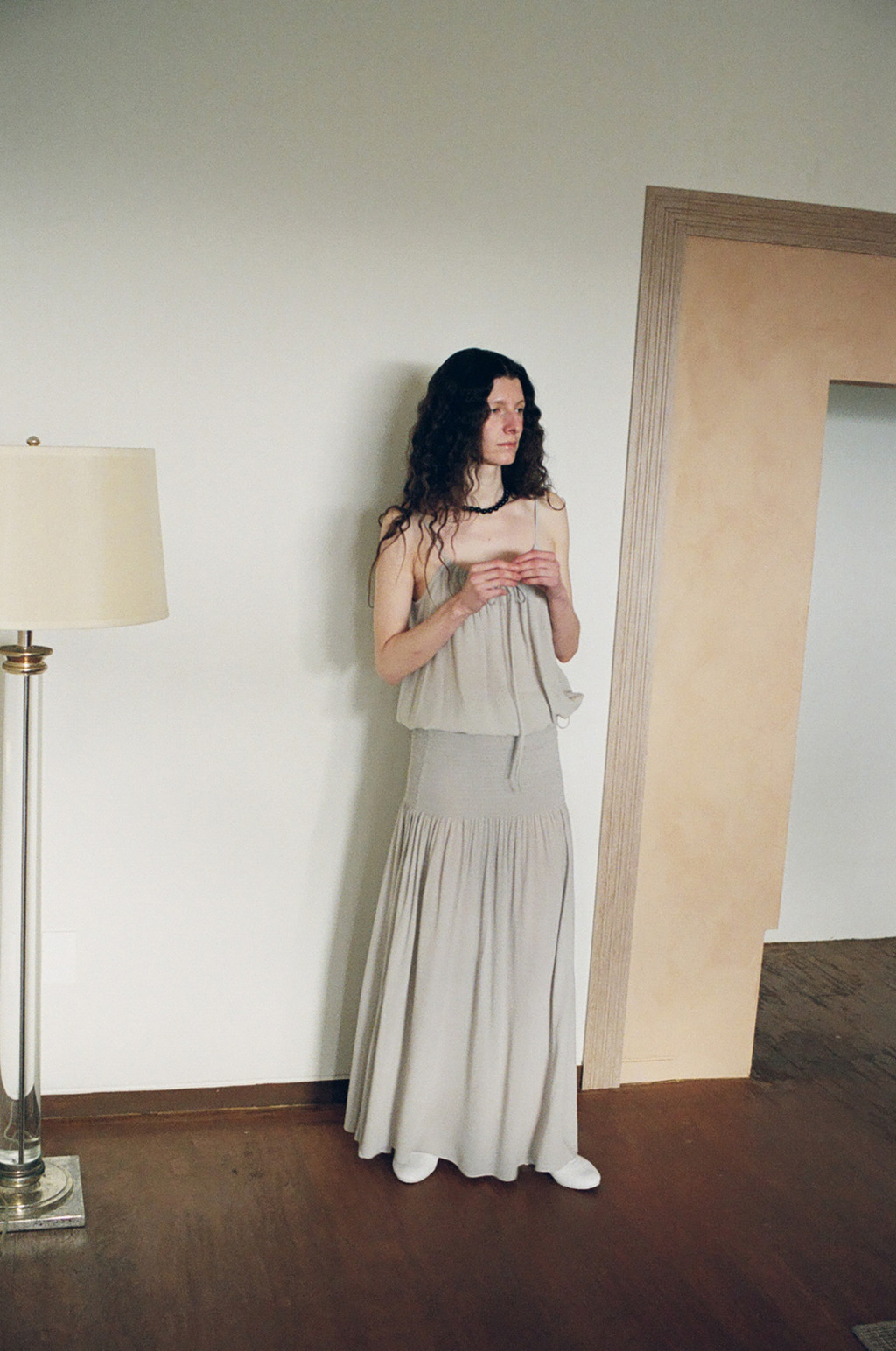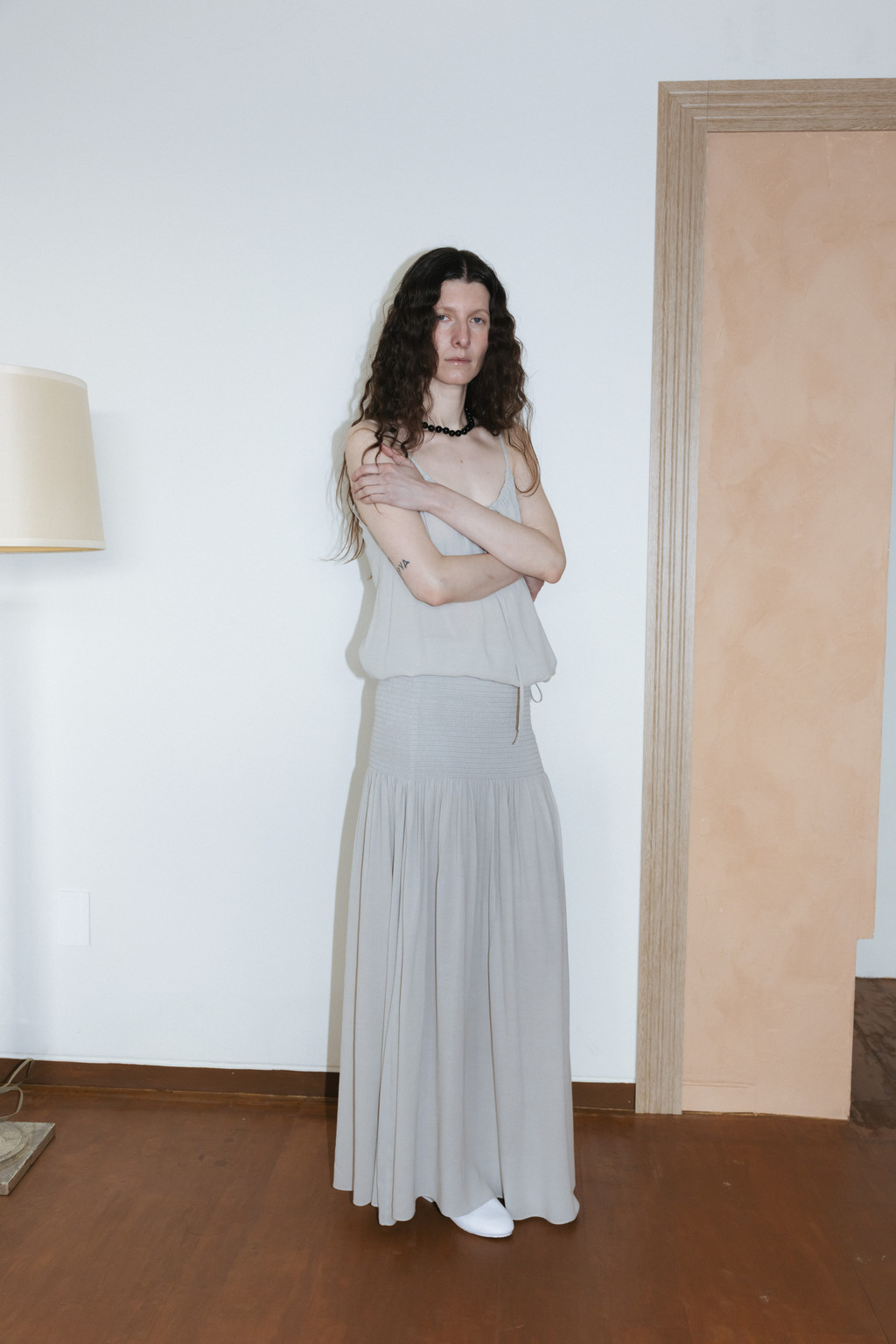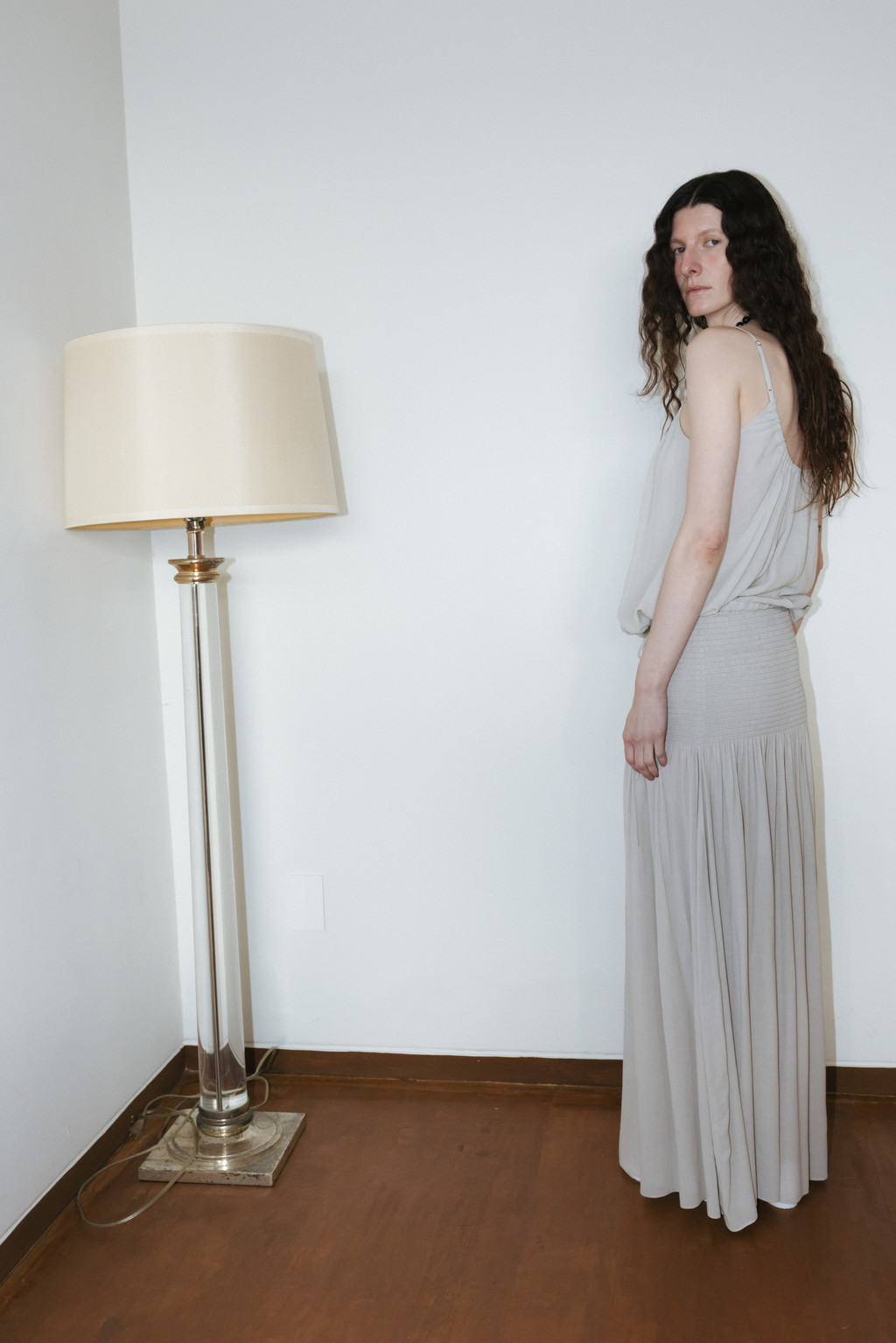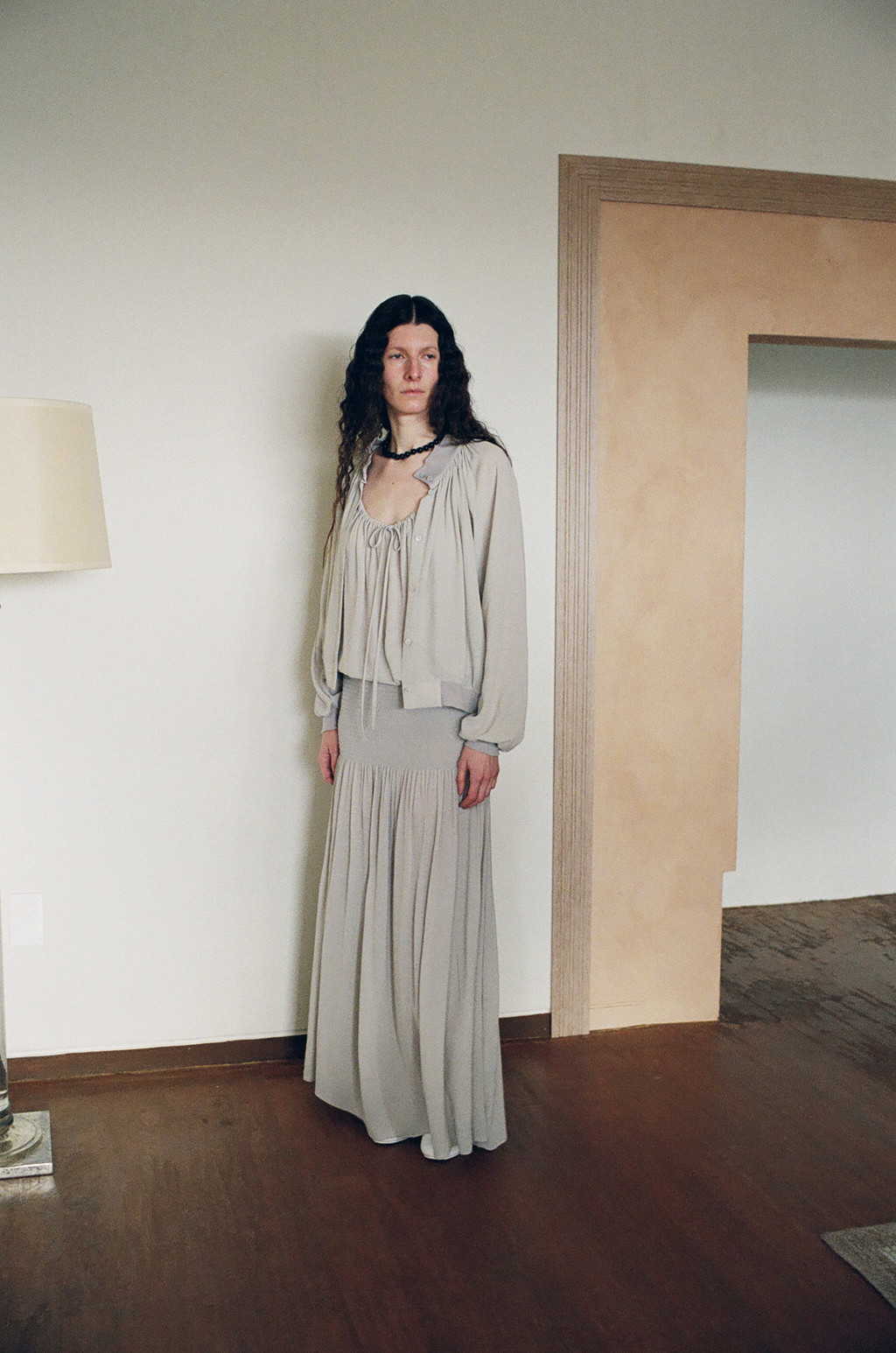 Draped Shirred Long Skirt (Light Gray / Brown)NEW