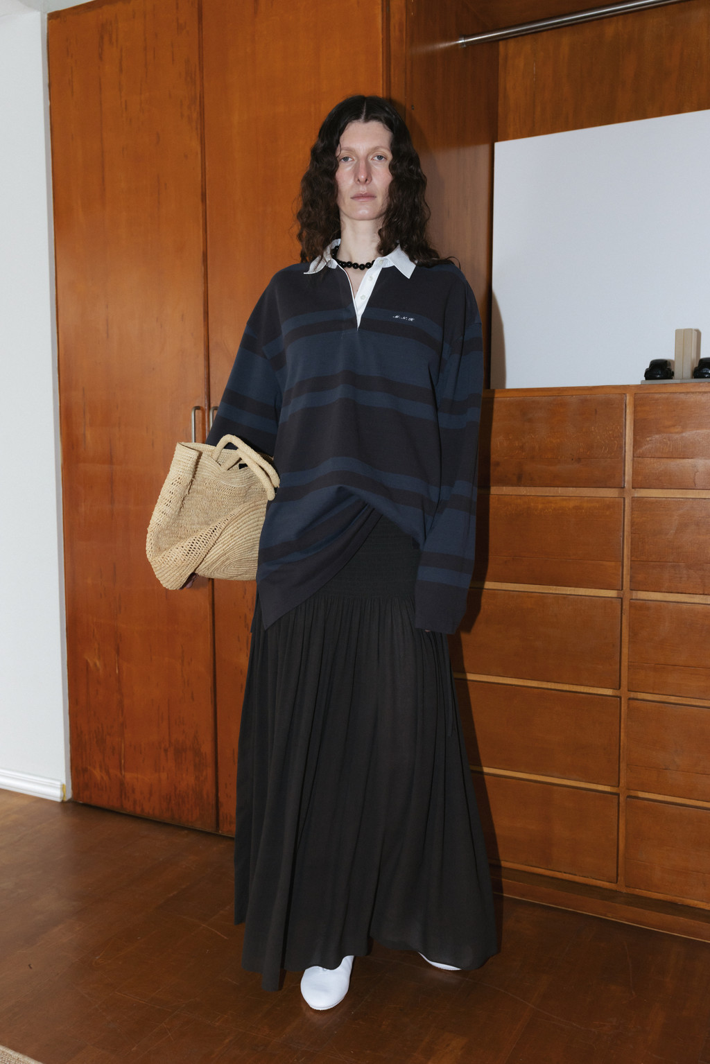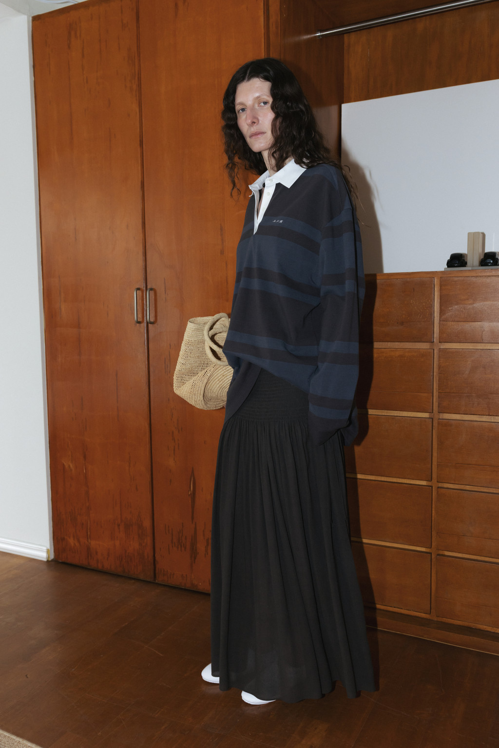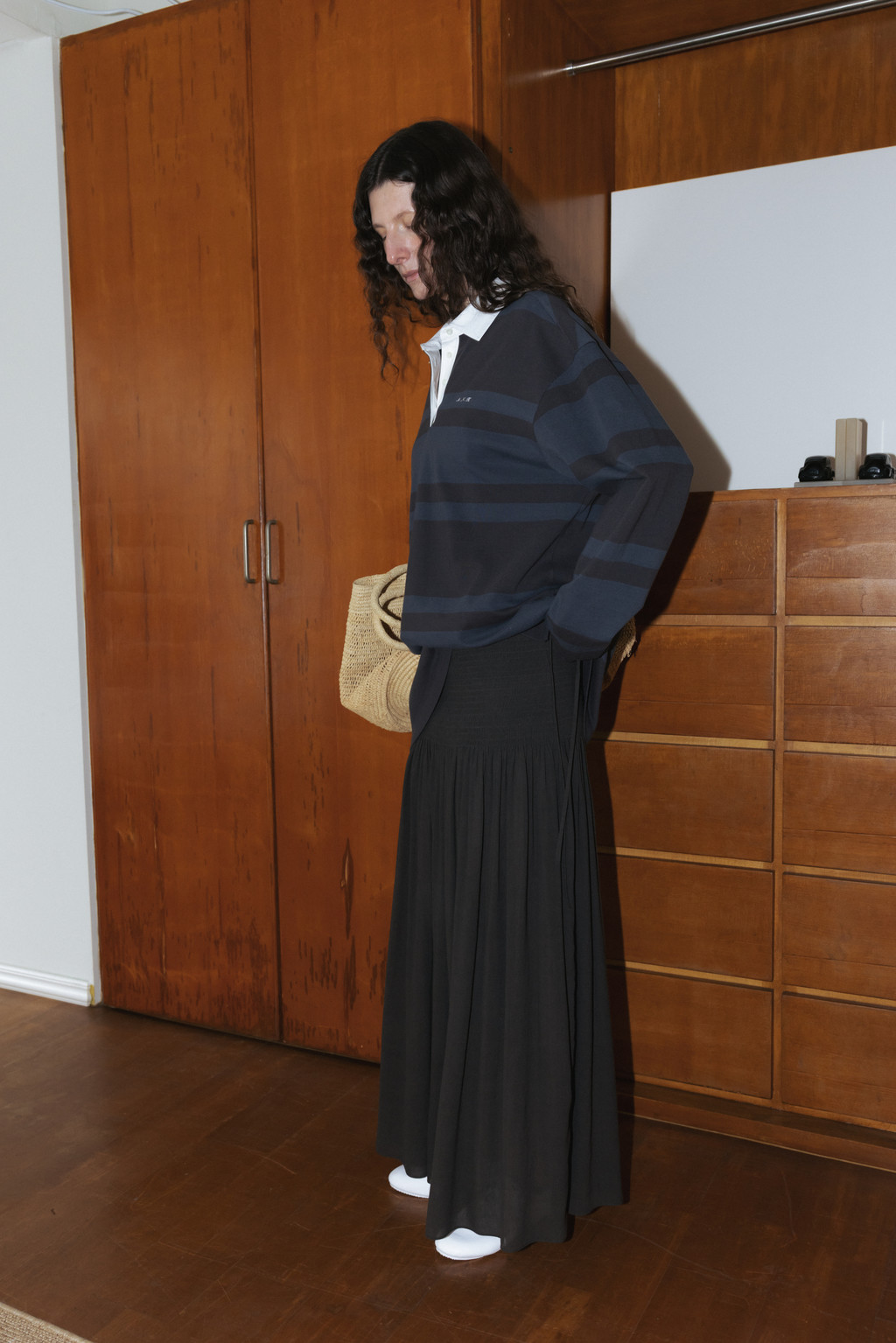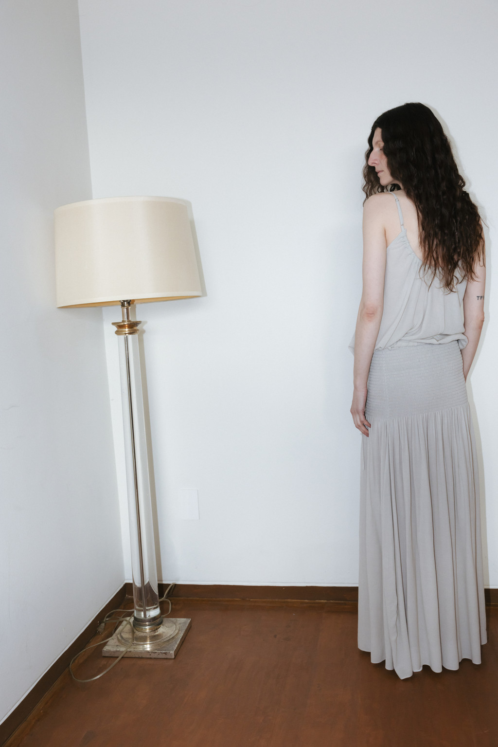 Draped Shirred Long Skirt (Light Gray / Brown)NEW