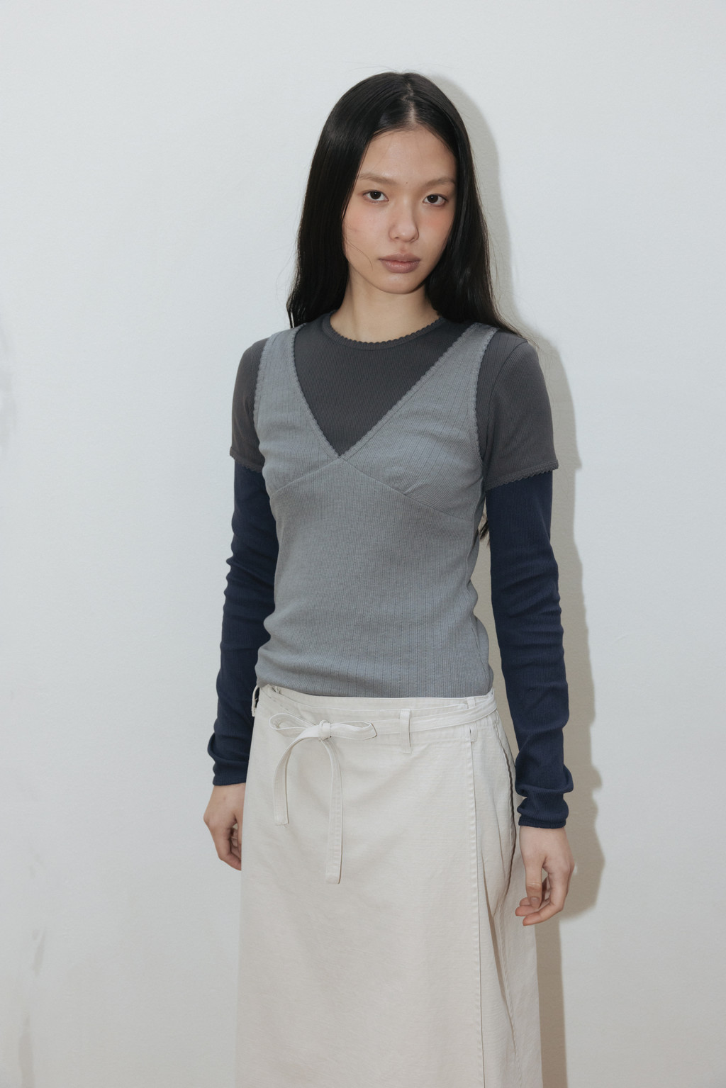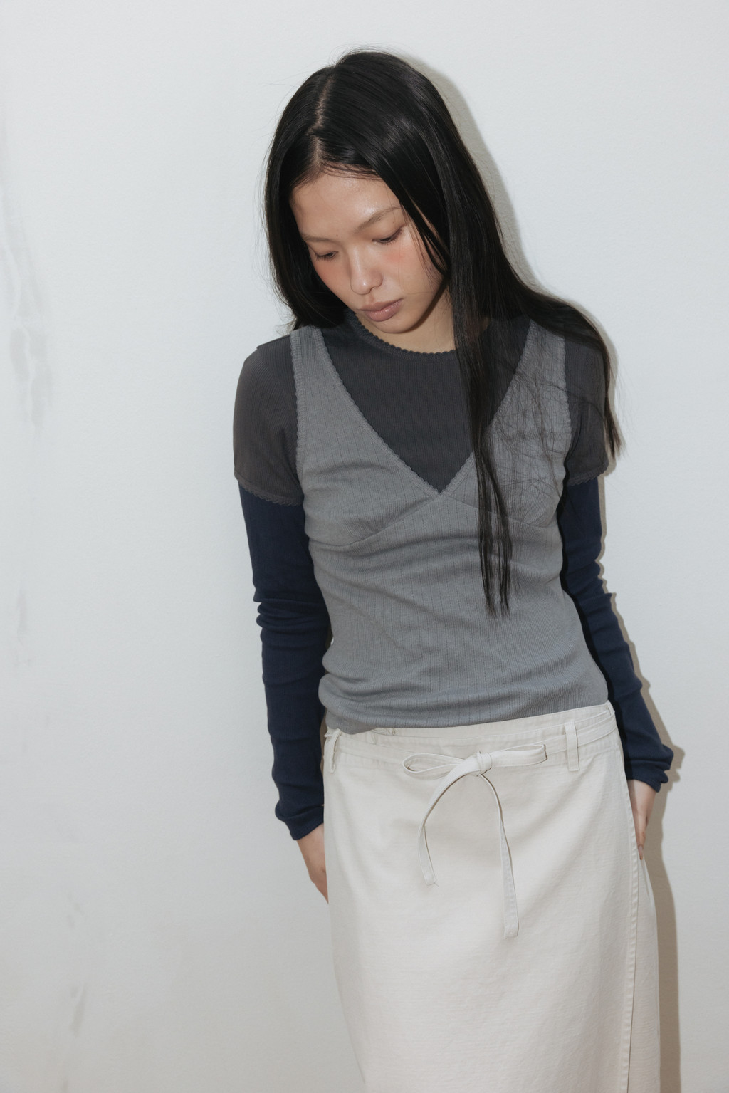Scallop Ribbed Jersey Long Sleeve (White / Dark Navy)NEW