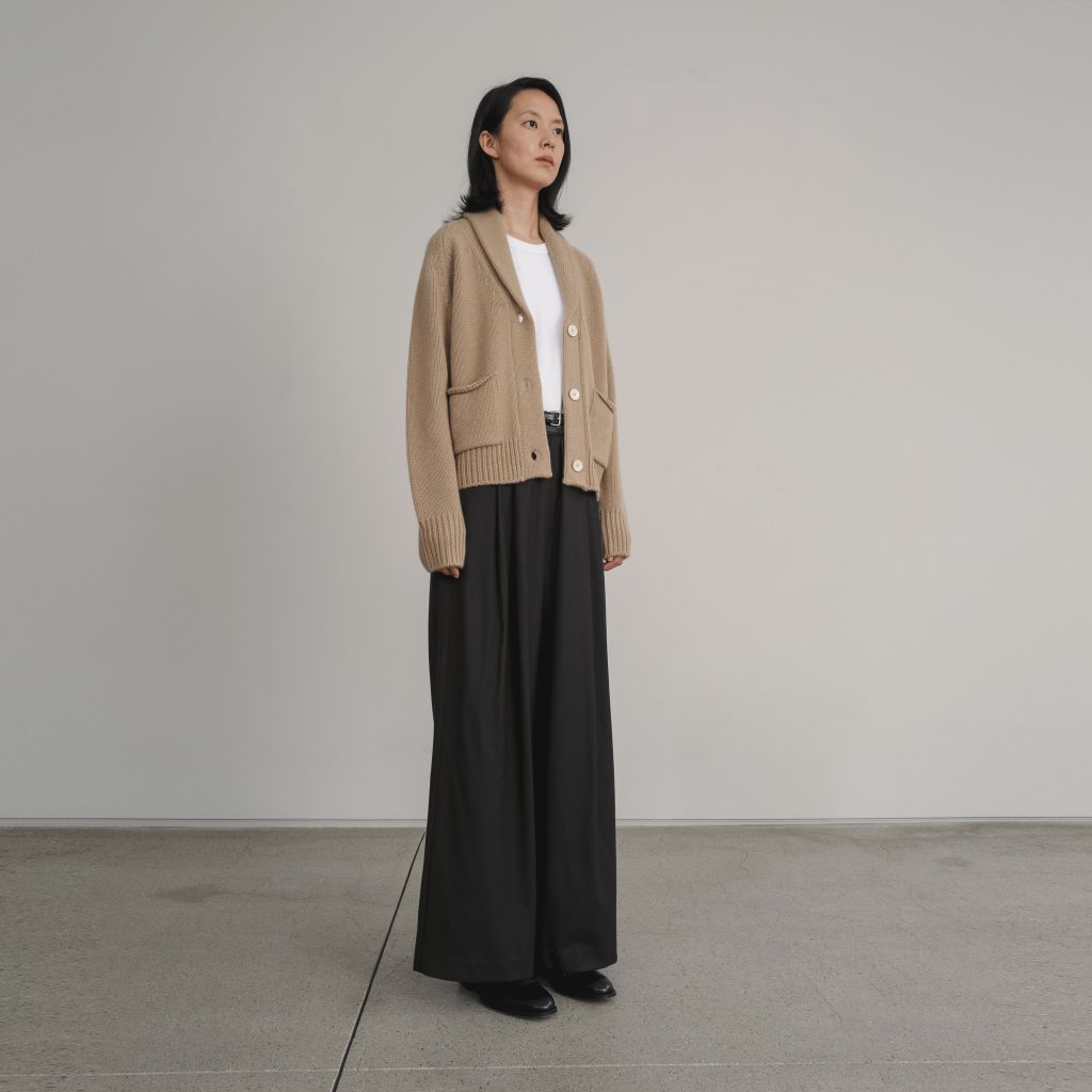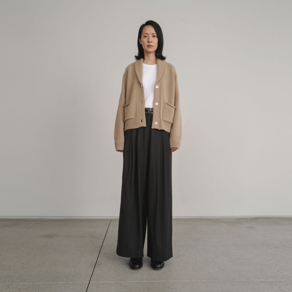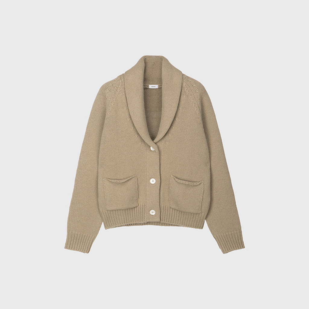 숄 칼라와 라글란 소매, 오픈 포켓이 어우러져 클래식한 무드가 느껴지는 가디건입니다. 와이드 투턱팬츠나 롱스커트 등 다양한 착장에 스타일링이 용이한 아이템입니다.