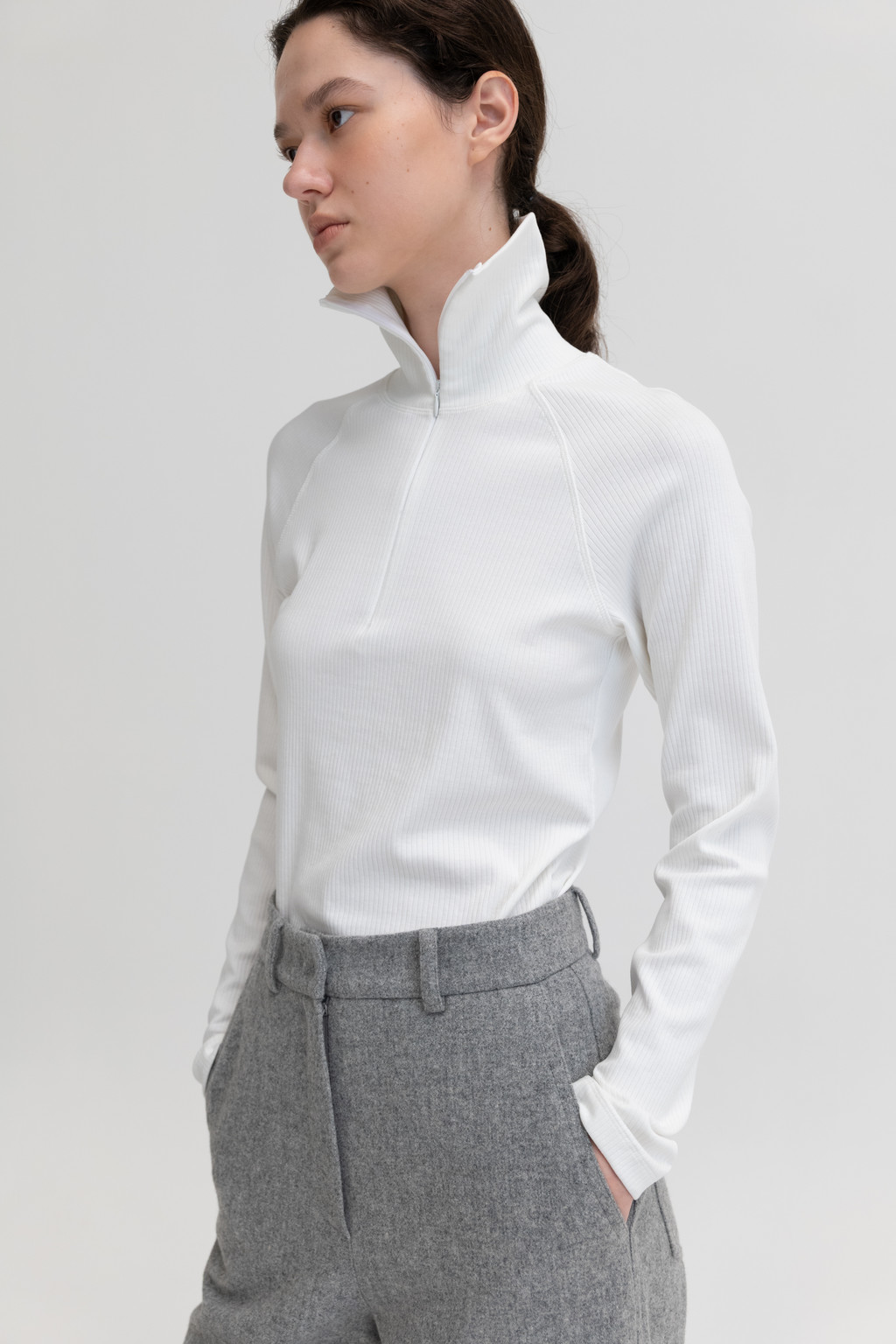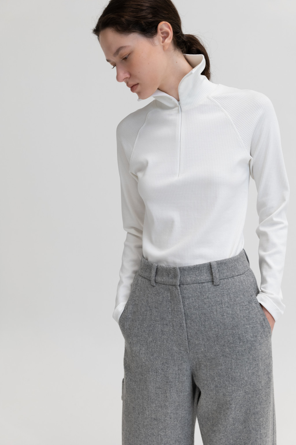 밀도감이 높은 코튼 소재로 만든 집업 폴라입니다. 클래식한 조직감이 특징이며 겉으로 드러나지 않는 지퍼를 사용해 미니멀하게 디자인하였습니다. 턱까지 올라오는 기장이며 지퍼를 사용하여 카라 연출이 가능합니다. 탄력이 좋아 다양한 체형에 맞게 입으실 수 있는 데일리한 아이템 입니다.