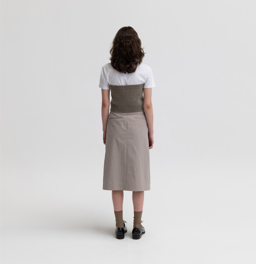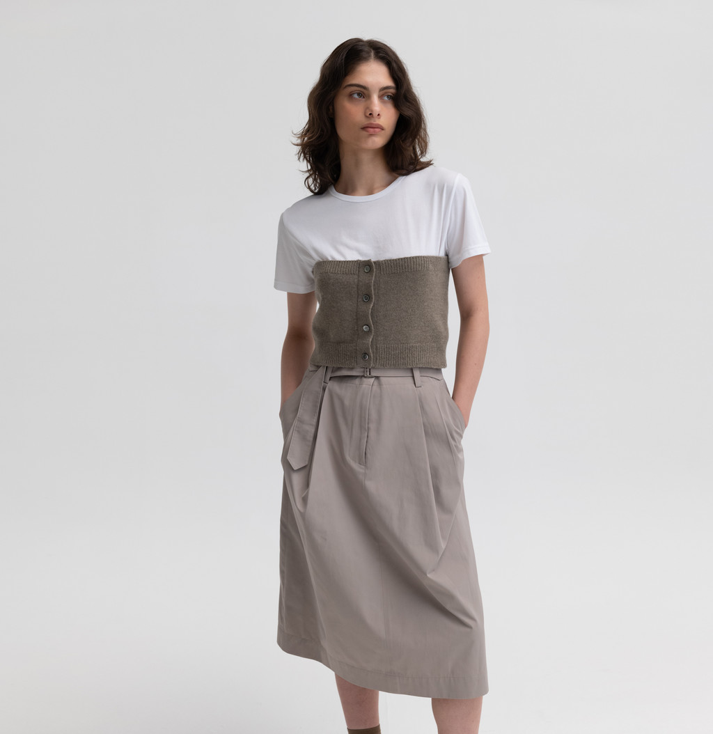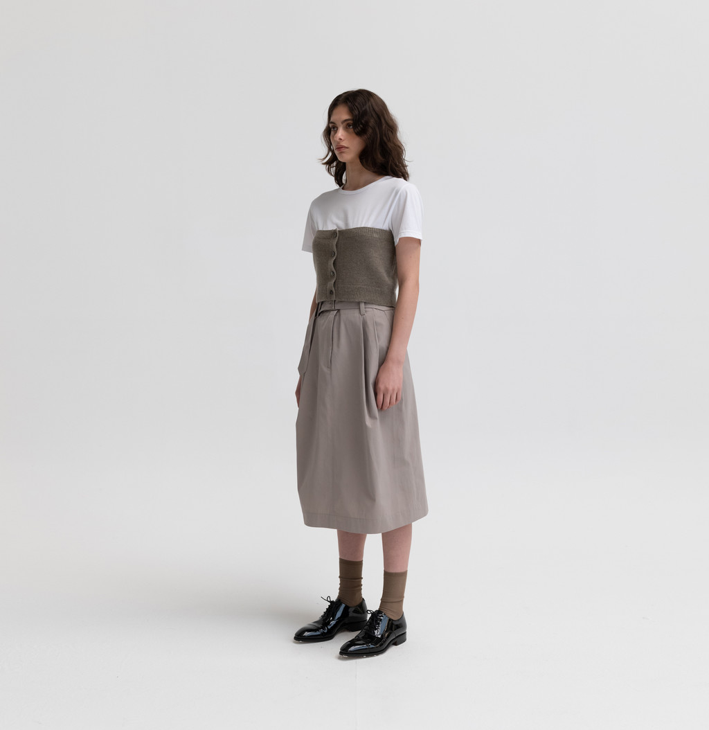 은은한 광택이 느껴지는 고밀도의 코튼 혼방인 소재를 사용하여 만든 벨트 스커트입니다. 턱이 있어 사이즈가 넉넉하고 밑으로 갈수록 둥근 실루엣이 특징입니다. 따뜻함이 느껴지는 안감을 덧대어 보온성을 높였습니다. 다양한 신발에 잘 어울리는 무릎까지의 기장감이며, 캐주얼한 무드를 잘 나타내어 줍니다.