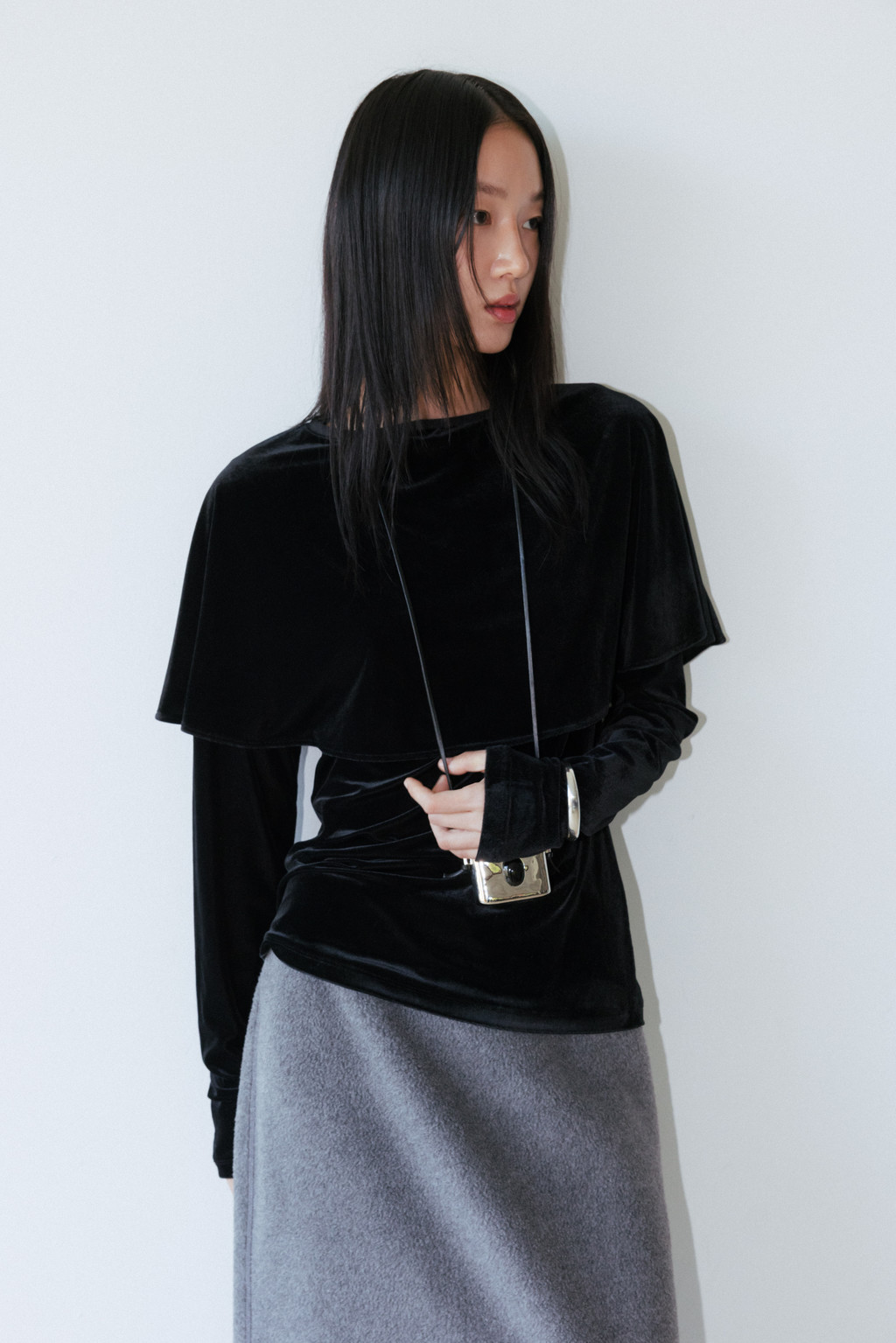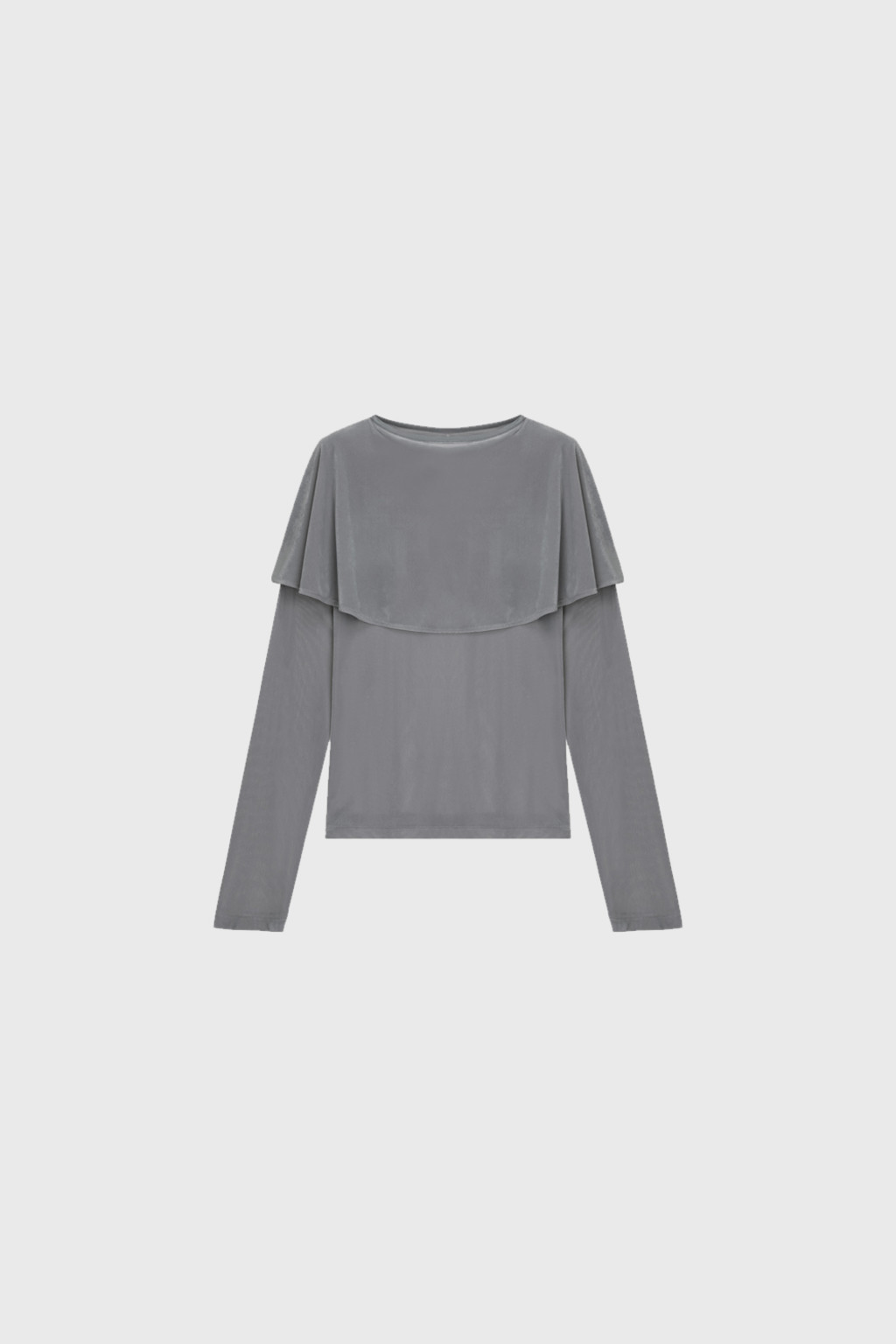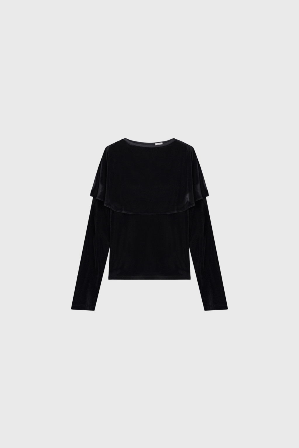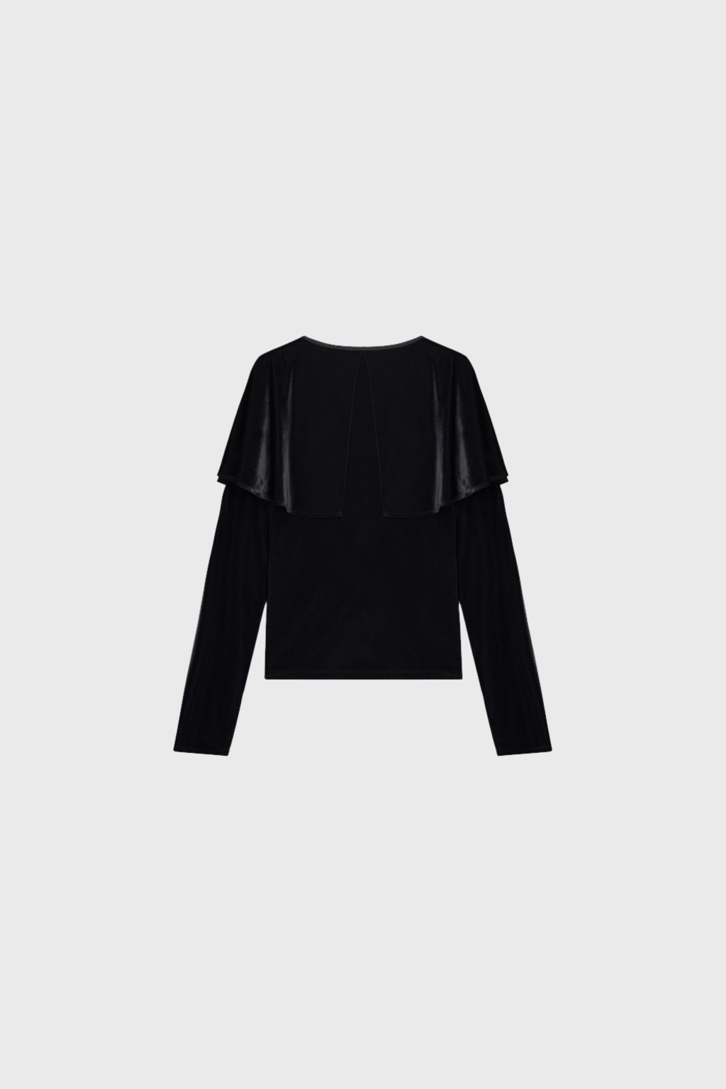 은은한 광택이 있는 벨벳 져지 소재로 제작된 티셔츠입니다. 연말 시즌 활용하기 좋은 아이템으로, 몸판은 슬림하게 맞으며 어깨와 소매를 따라 부드럽게 흐르는 케이프 디테일이 특징입니다.