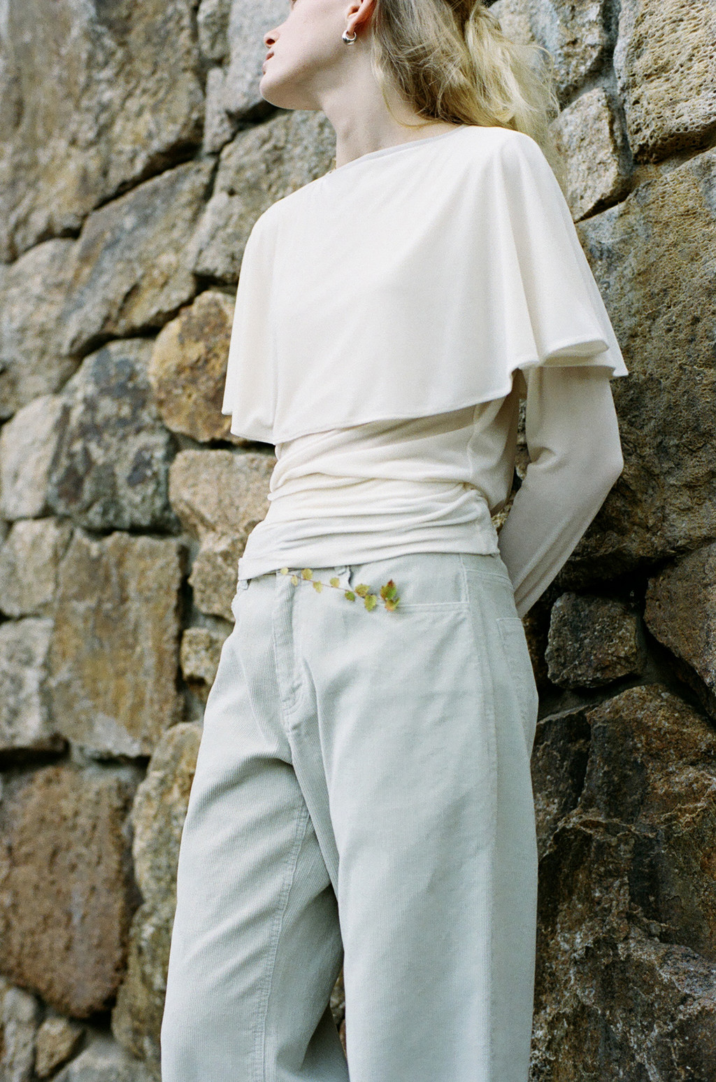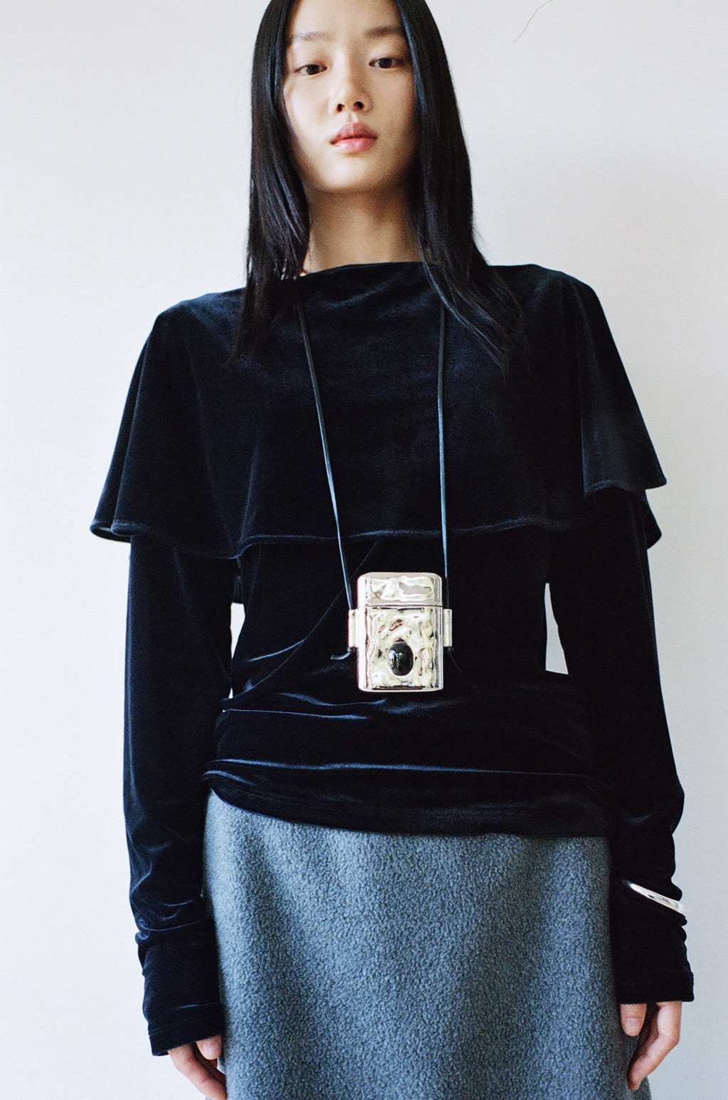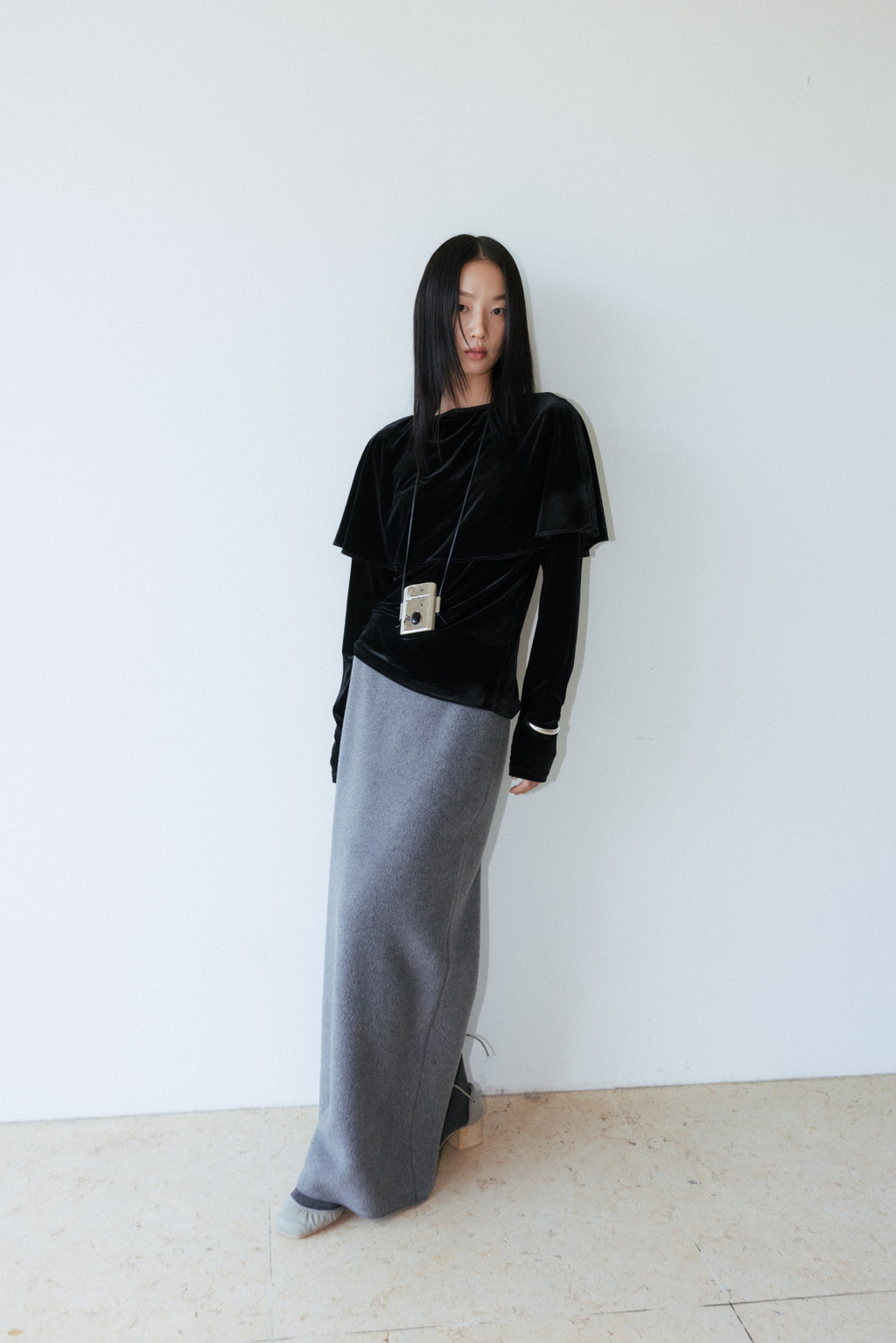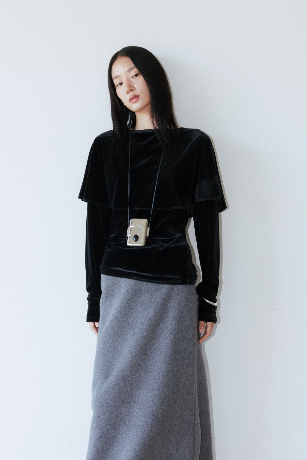 은은한 광택이 있는 벨벳 져지 소재로 제작된 티셔츠입니다. 연말 시즌 활용하기 좋은 아이템으로, 몸판은 슬림하게 맞으며 어깨와 소매를 따라 부드럽게 흐르는 케이프 디테일이 특징입니다.